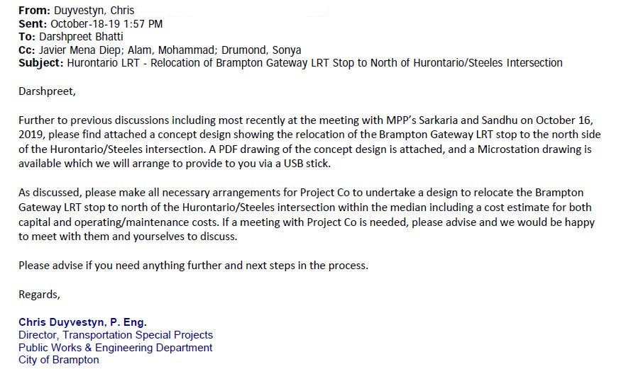 On October 18, 2019, Chris Duyvestyn, the Director of Transportation Special Projects at Brampton’s Public Works & Engineering Department, wrote to Darshpreet Bhatti, Metrolinx Vice President for the Hurontario LRT, requesting Mobilinx to relocate the Brampton Gateway stop to the north side of the Hurontario/Steeles intersection. Drawings of the revised LRT design at Steeles Avenue is included in the email as an attachment.