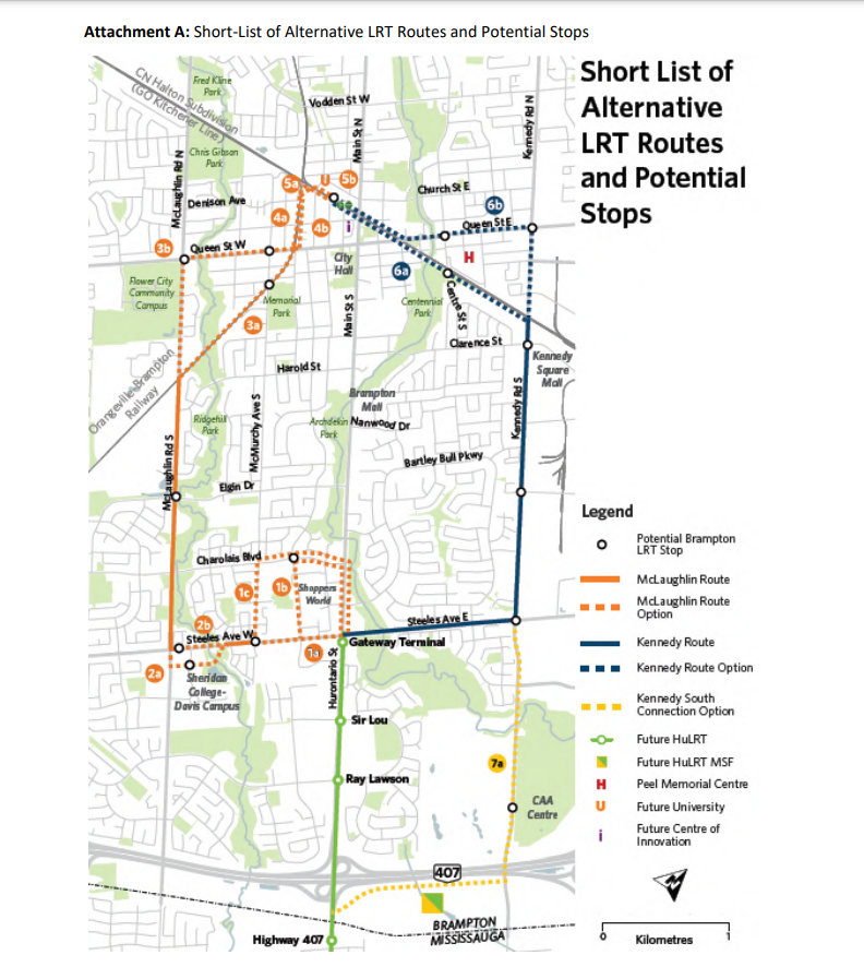 In June 2018, a short-list of alternative LRT routes from Steeles Avenue to Downtown Brampton was presented at a public open house, referencing a new university site promised by the previous Liberal government. Fourteen potential routes were depicted in a report to Council; all add significant running time over a direct Main Street route.