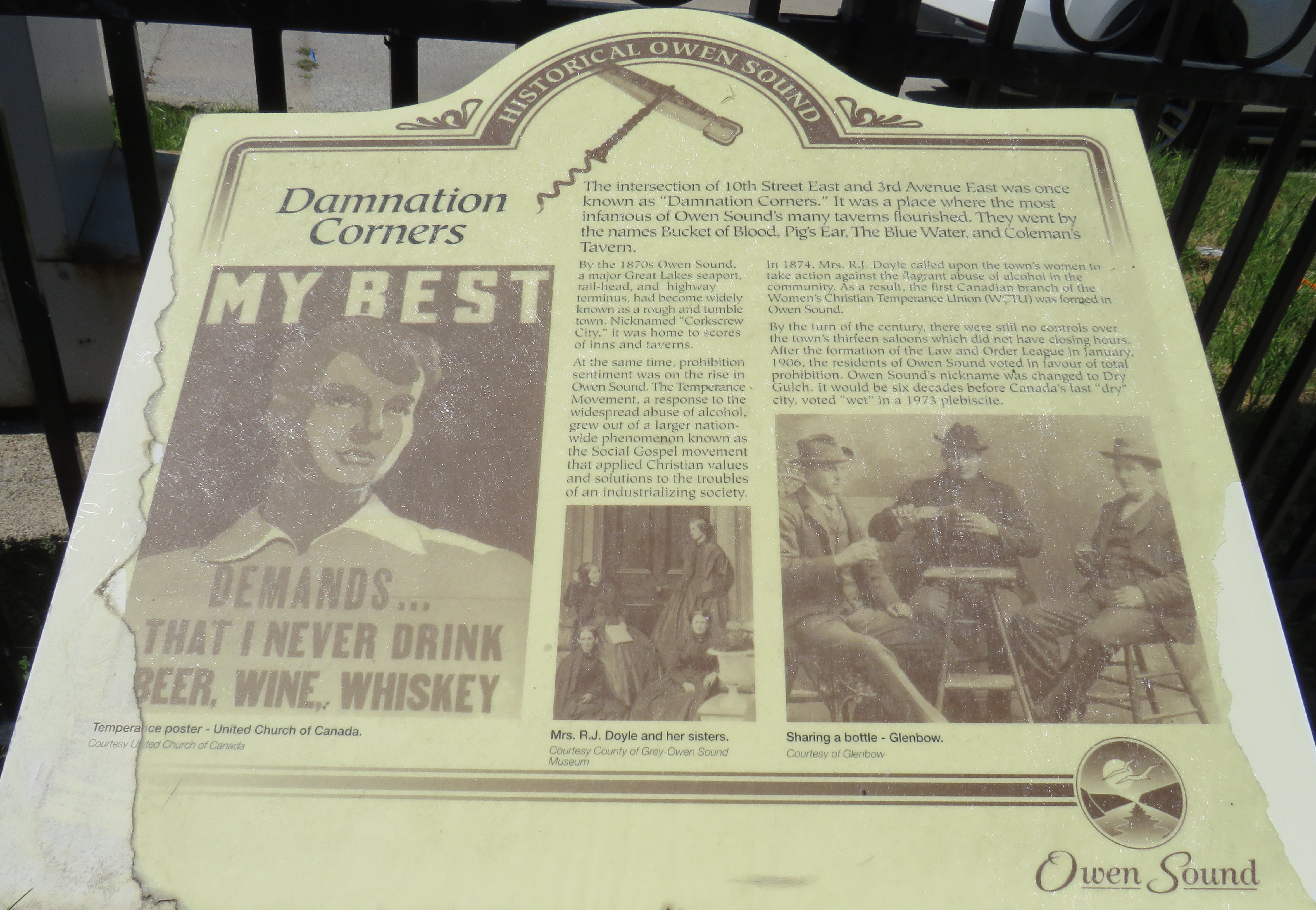 Plaque commemorating “Damnation Corners” where taverns once stood on all four corners. One block to the east was “Salvation Corners” where four Protestant churches still stand.