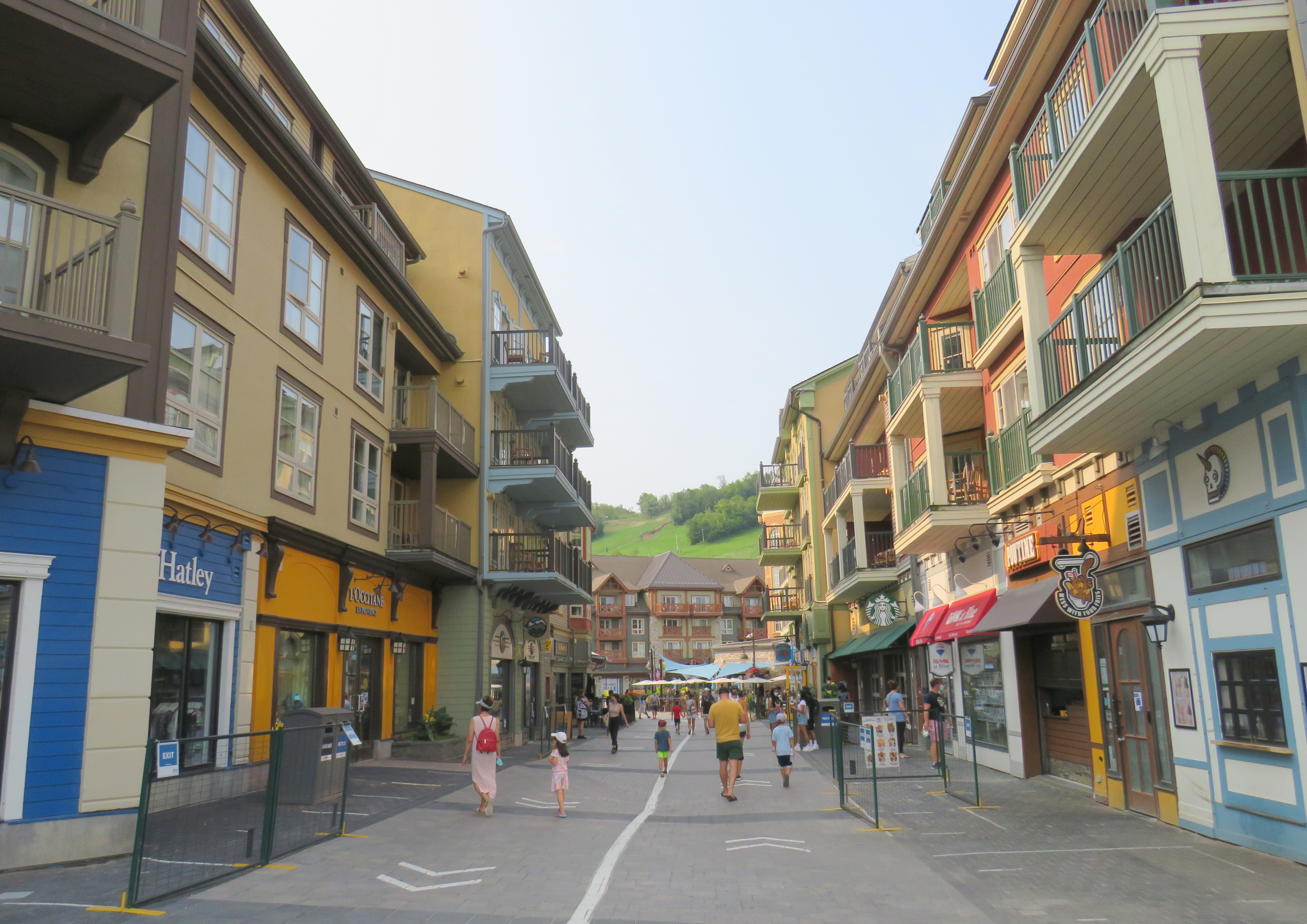 Blue Mountain Village, the heart of the sprawling Blue Mountain resort, contains many shops, restaurants and bars, along with three hotels and timeshare apartment complexes with the architecture and walkways meant to invoke a European ski resort. Cars are not permitted in the internal streets, which gives it a somewhat surreal atmosphere. In the summer, tourists and vacationers are attracted by several golf courses, downhill mountain biking trails, rope courses, spas, nearby beaches, and, of course, the shops.