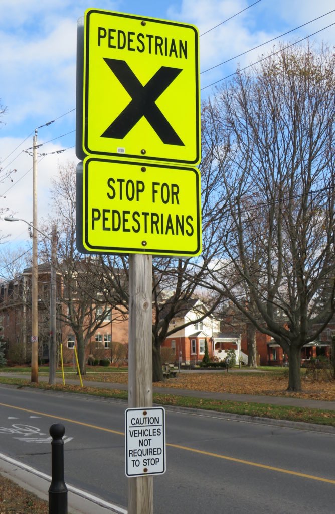 However, a smaller white sign below, facing the sidewalk, reads “CAUTION – VEHICLES NOT REQUIRED TO STOP.”