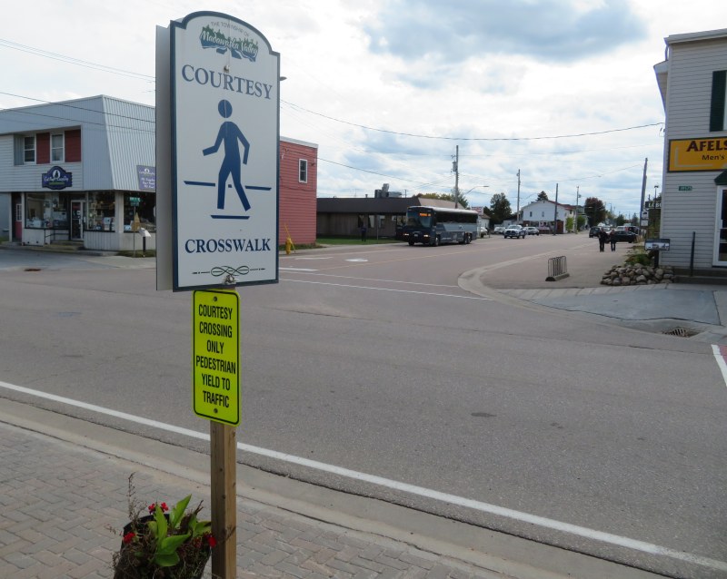 Therefore, since the crossing is not compliant with the OTM standard, and the signs facing motorists are advisory, not regulatory, pedestrians must yield. In a smaller town like Cobourg, drivers will generally yield. But the signage is confusing and should be replaced by the new Ontario pedestrian crossing standard with flashing beacons.