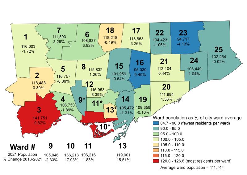 On the other extreme, Ward 3 Etobicoke-Lakeshore, represented by veteran councillor Mark Grimes, has a population of 141,751, growing by 9.82% since 2016. New condominium developments in the Humber Bay neighbourhood and along the Queensway have driven much of that growth. Ward 10, Spadina-Fort York, saw an even greater number of new residents move in, growing by nearly 18% in the last five years.