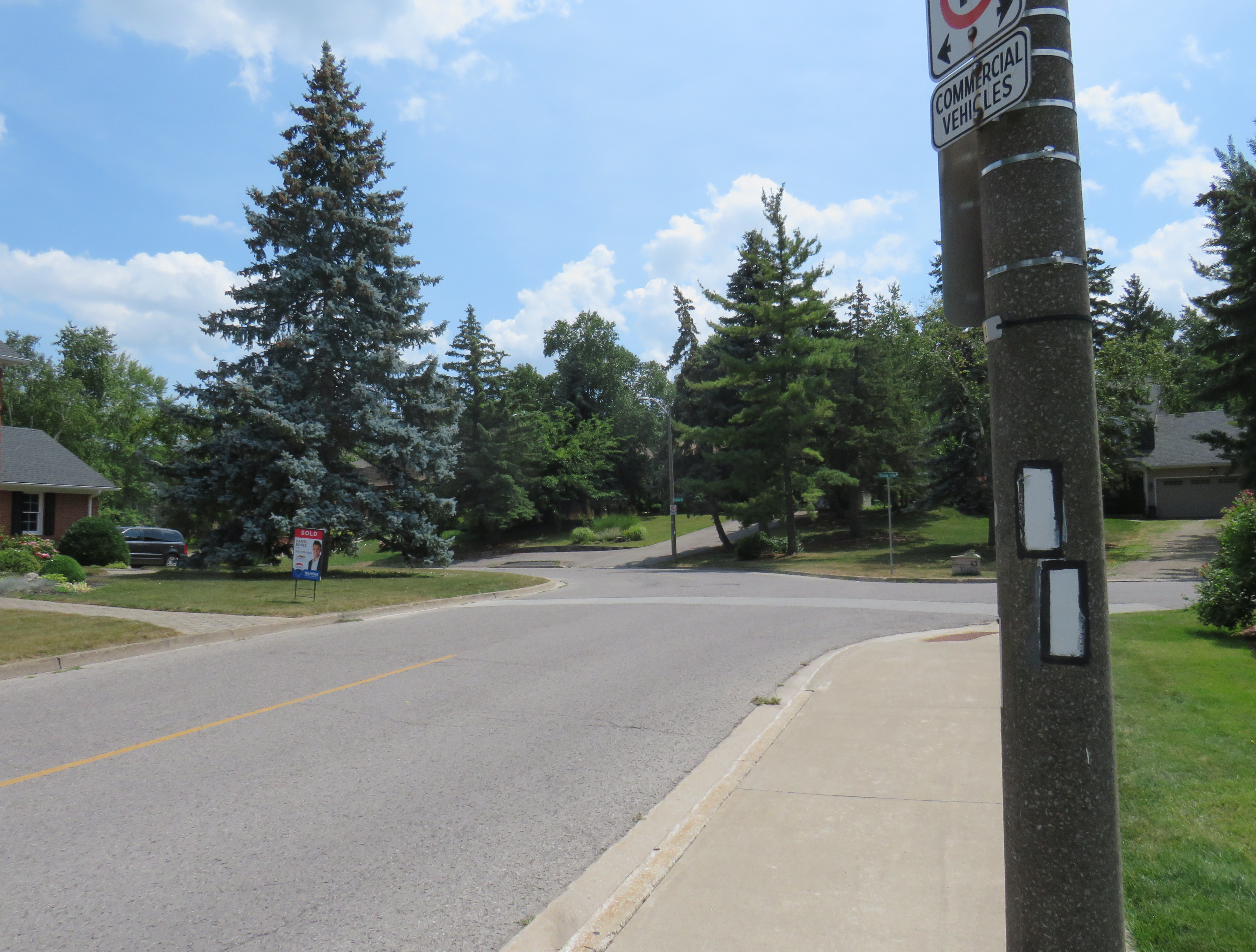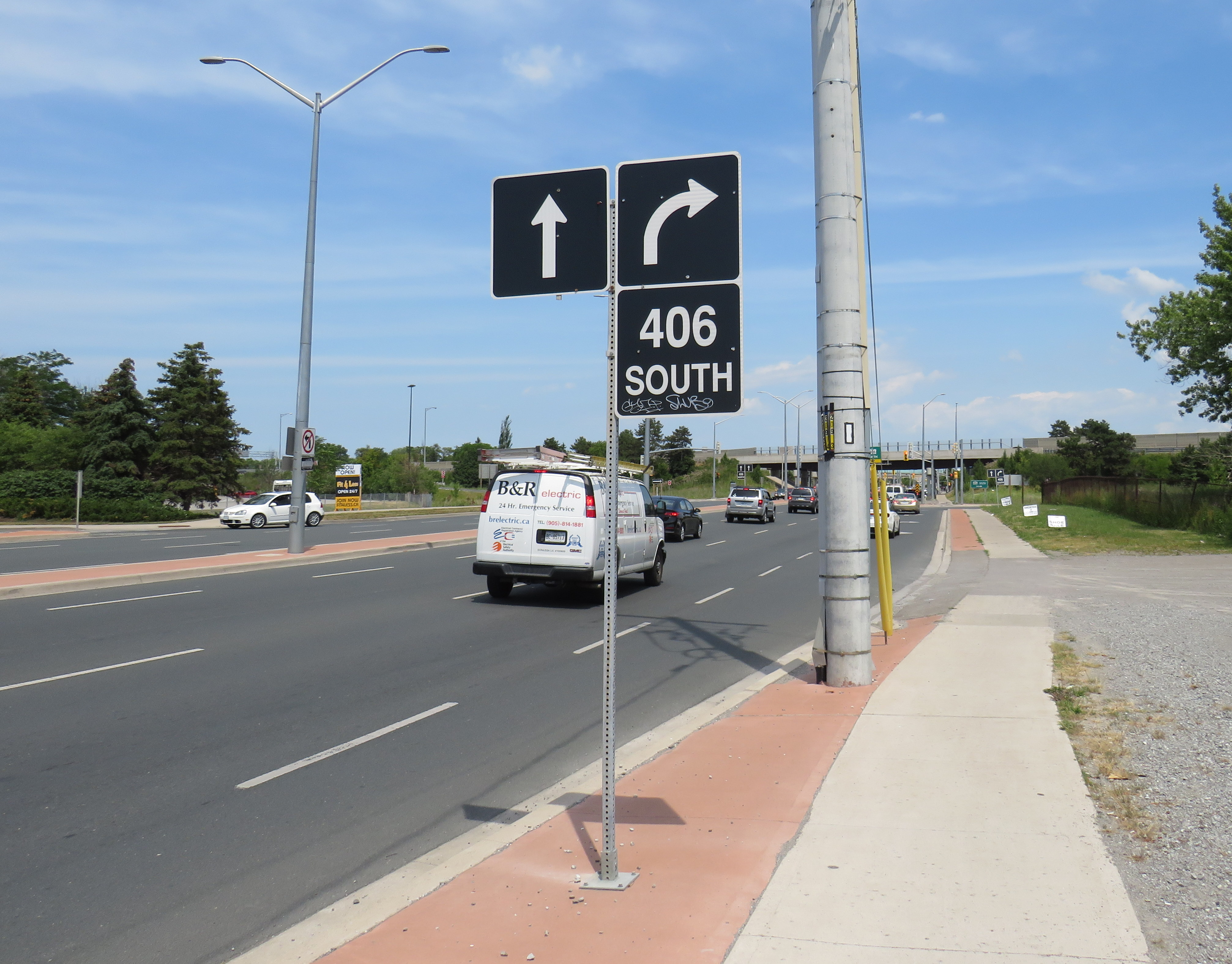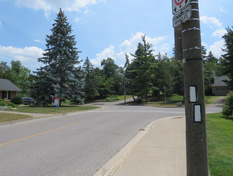 The trail continues to busy Glendale Avenue, and crosses Highway 406 at the interchange. At each traffic light, pedestrians are required to press the “beg button” to get a walk signal, even if one is crossing in the same direction as the through traffic. In most other places, the walk signal comes on automatically in conjunction with the dominant traffic flow.