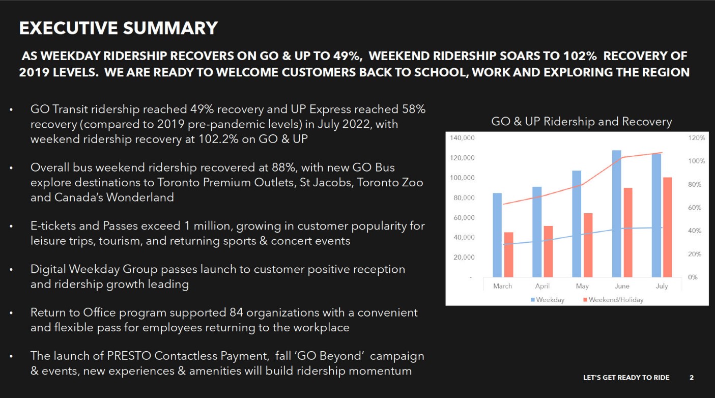 By July 2022, Metrolinx reported weekday ridership at 49% of pre-pandemic levels at GO Transit and Union-Pearson Express (UPX). Continued work-from-home in the corporate office sector that has traditionally been GO Transit’s bread-and-butter (given its focus on commuter operations to and from Union Station) is the simple explanation for this long-term trend. However, weekend bus and rail ridership skyrocketed: while the bus network has 88% of pre-pandemic weekend ridership, the entire system, rail included, is at 102.2% of Summer 2019. The return of traditional summer events, such as Pride and Caribana, concerts, as well as Blue Jays and TFC matches, along with weekend fare discounts, drove that increase.