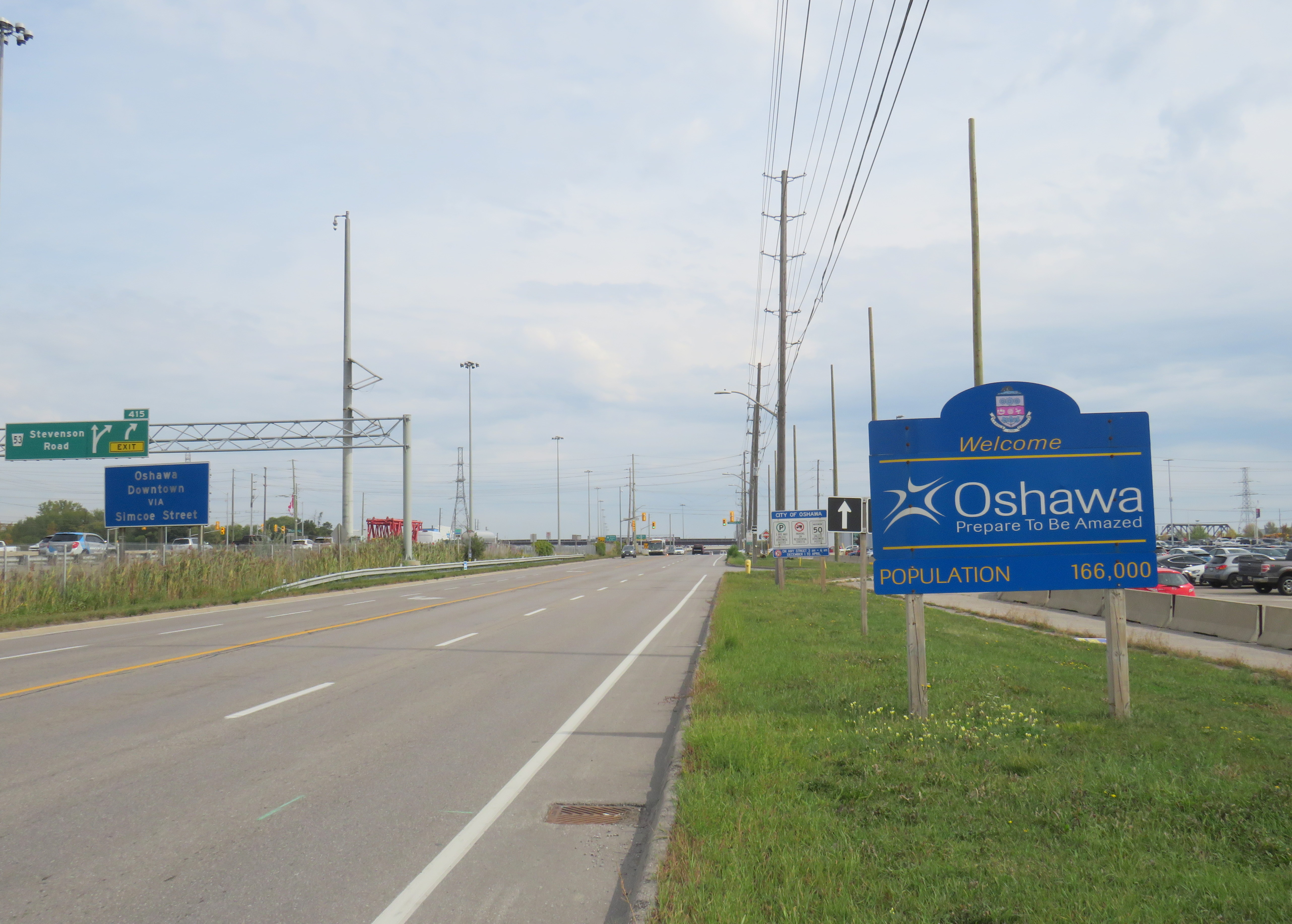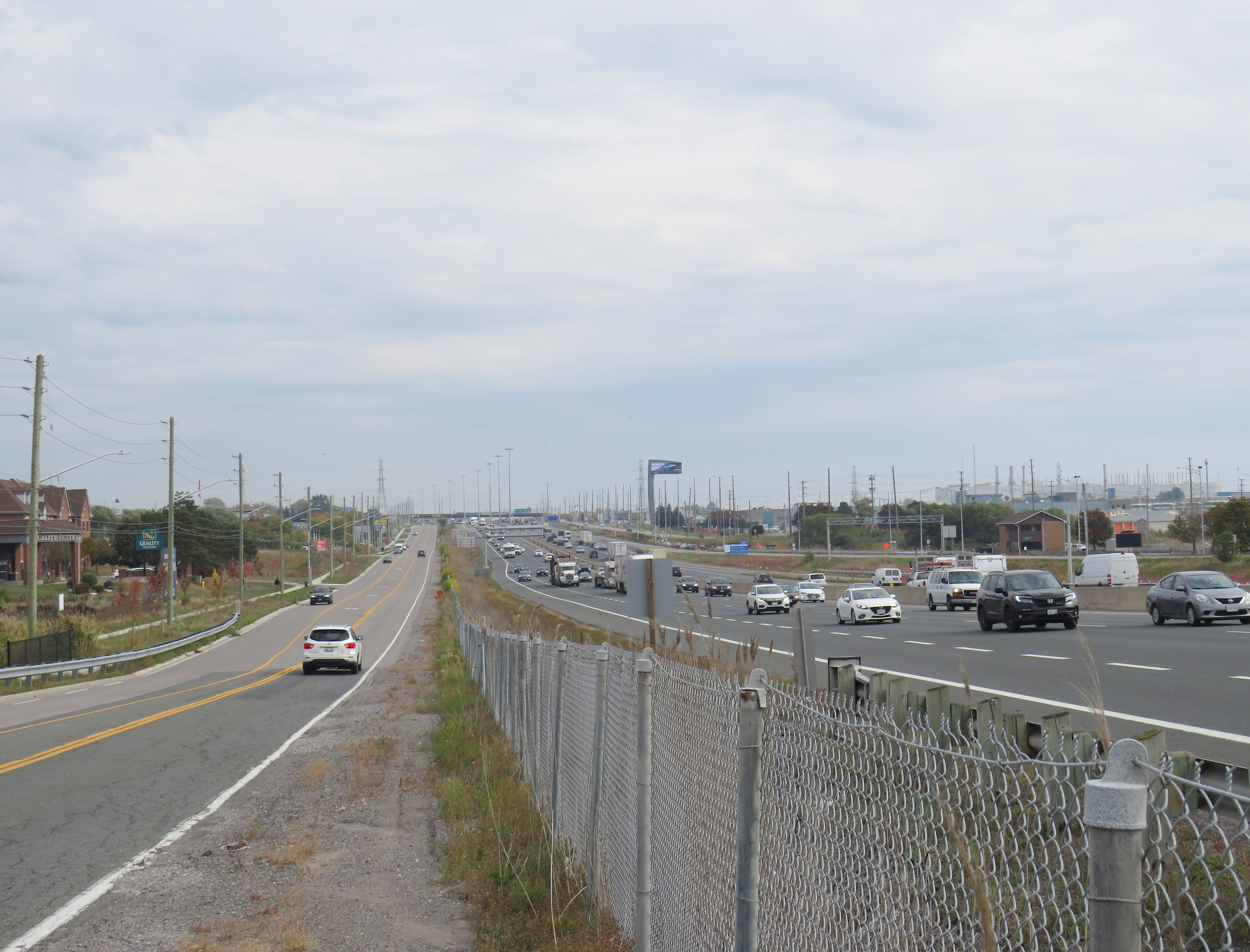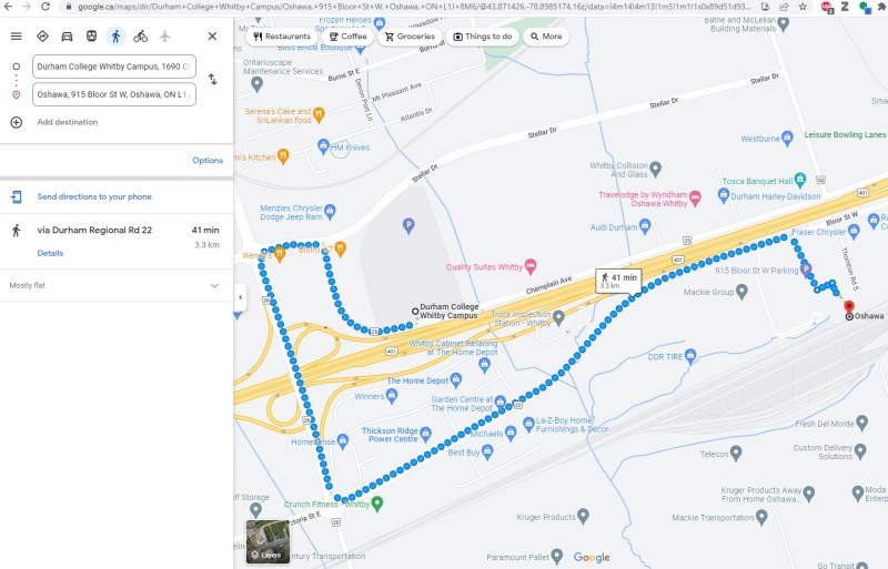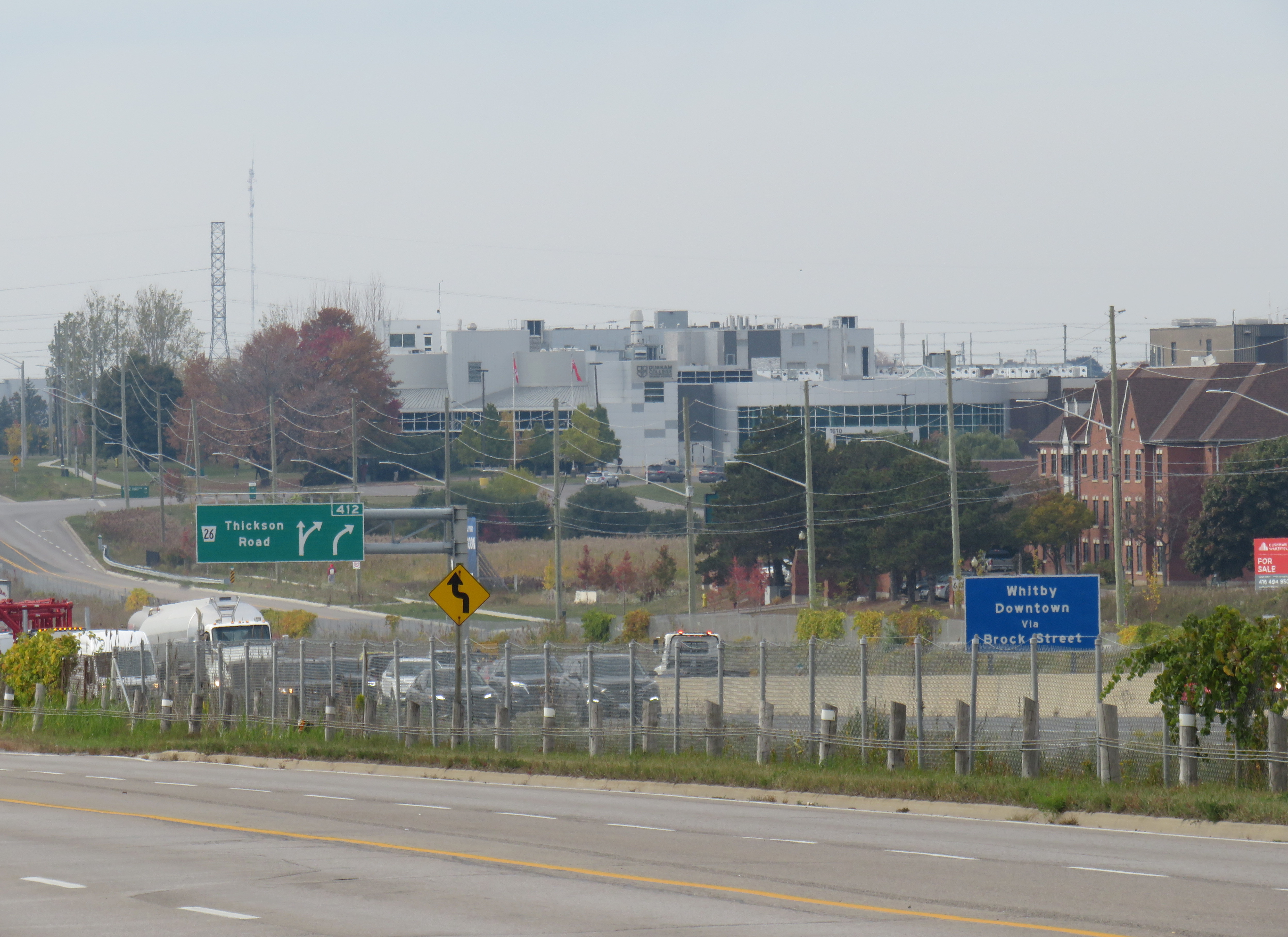 However, the Whitby campus is even harder to get to from Oshawa GO than the main Oshawa campus because it is separated by Highway 401. It is a 41 minute walk between the station and the Whitby college campus along Victoria Street (which has no sidewalks along most of its length), Thickson Road, Stellar Drive, and Champlain Avenue, though a footbridge over the highway would reduce the walking time to a more comfortable 15 minutes.