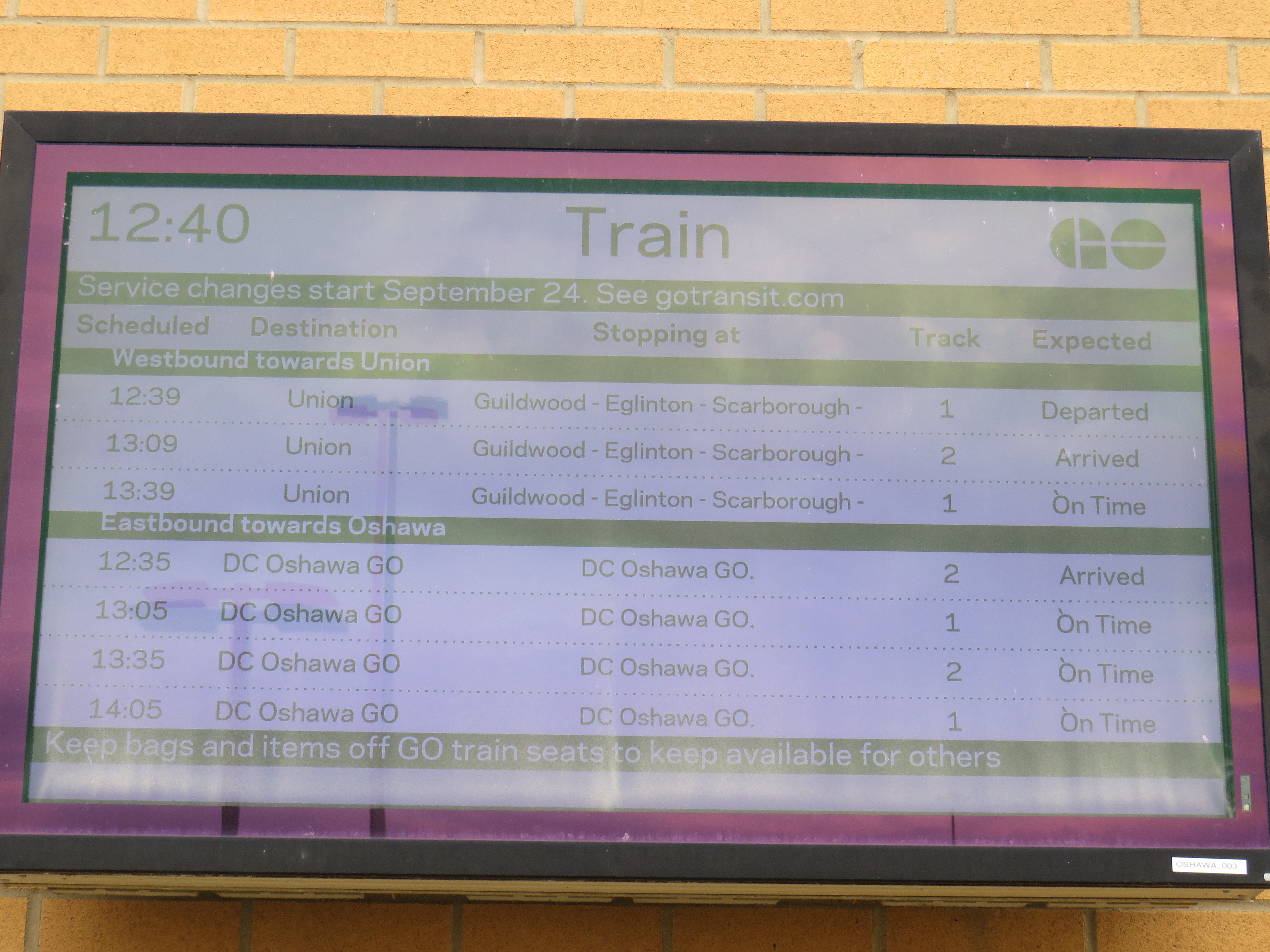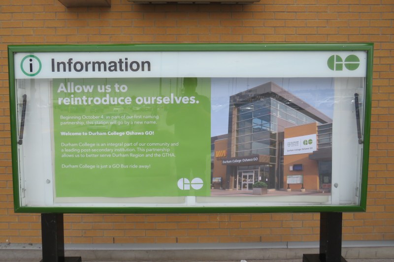 Firstly, though “Oshawa” remains in the station name, Durham College comes first with the new moniker. Schedules, signs, and maps will be updated to reflect the new name, while announcements by on-board staff and digital schedule information already reflect the new name. VIA Rail, which shares the station with GO Transit, is not a party to the agreement, and will likely continue referring to the station as “Oshawa.”