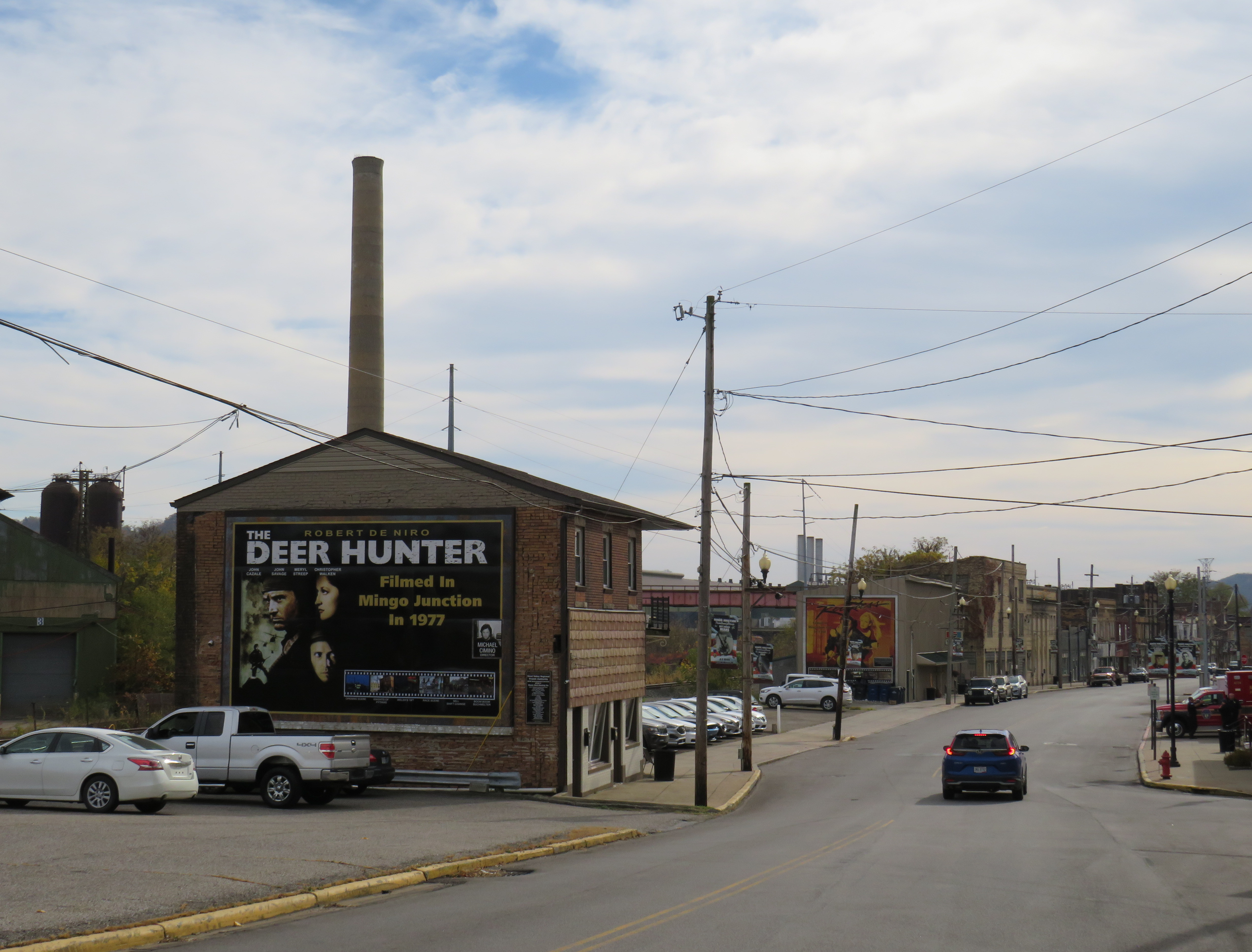 Just a few miles to the south is the town of Mingo Junction, Ohio, one of many industrial communities along the Ohio River in Pennsylvania, West Virginia, Ohio, and Kentucky. Mingo Junction is best known as a filming location for movies including the acclaimed 1977 film “The Deer Hunter.” The town now celebrates its cinematic history with large vinyl signs displayed on the north end of Mingo Junction’s main street.