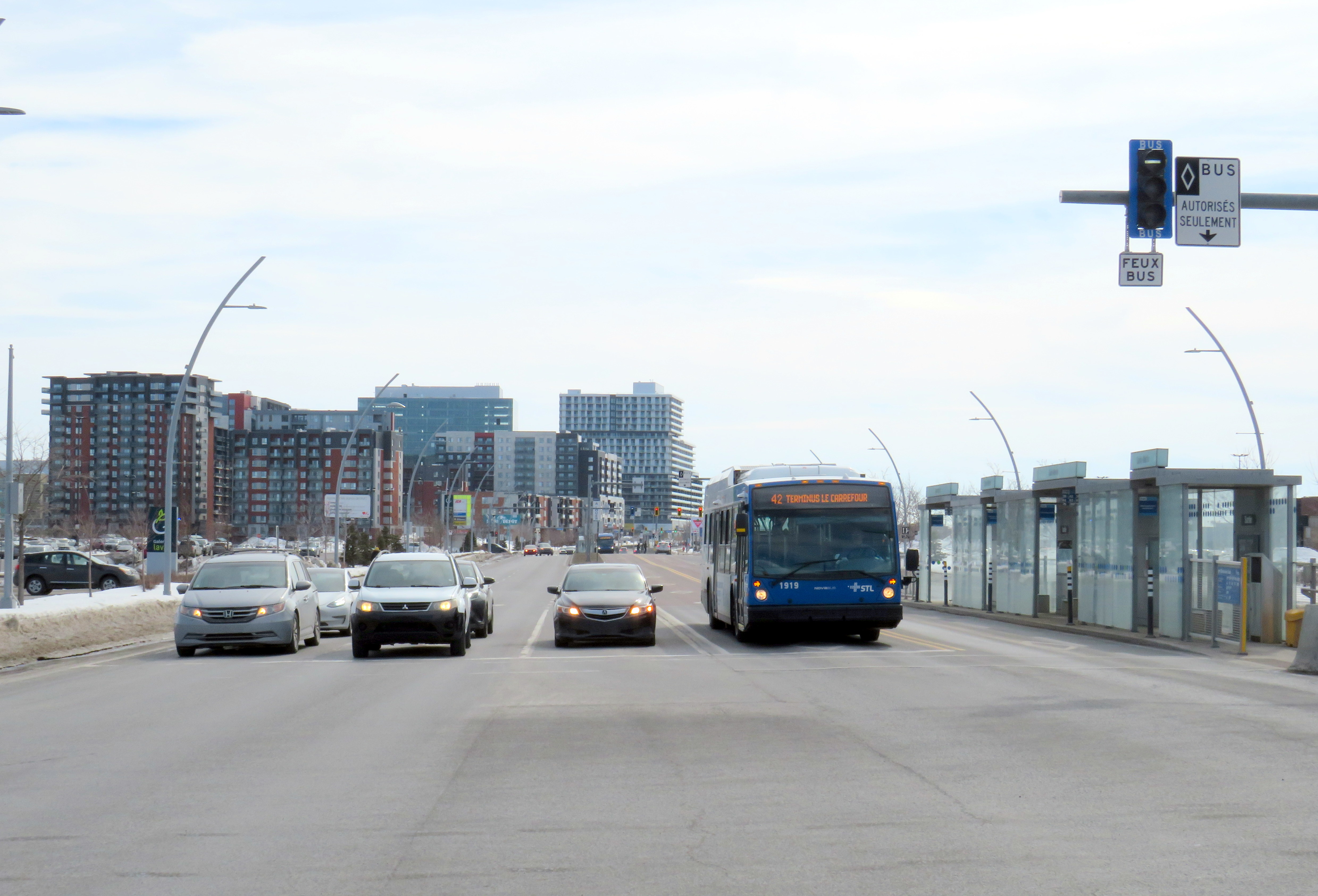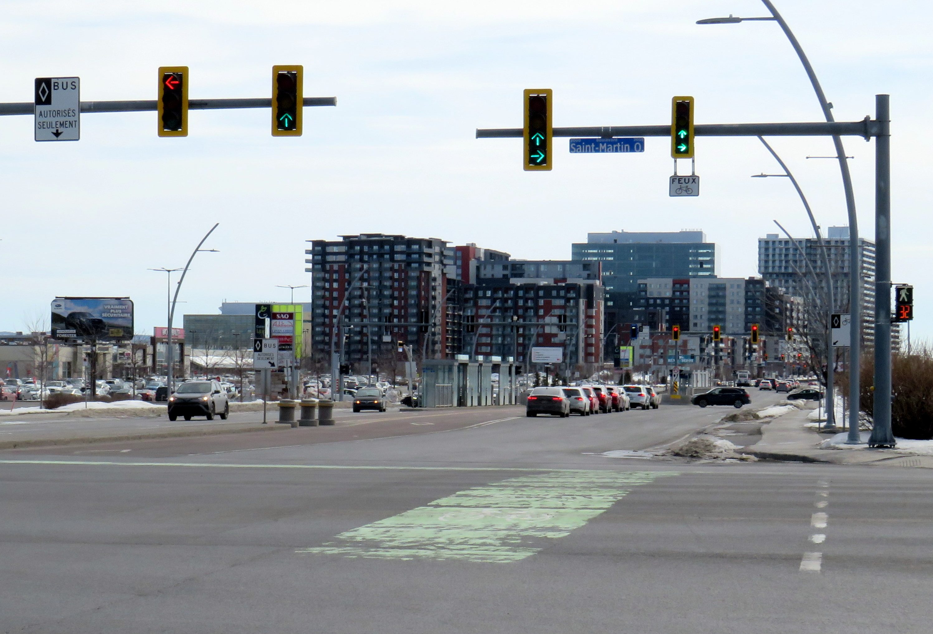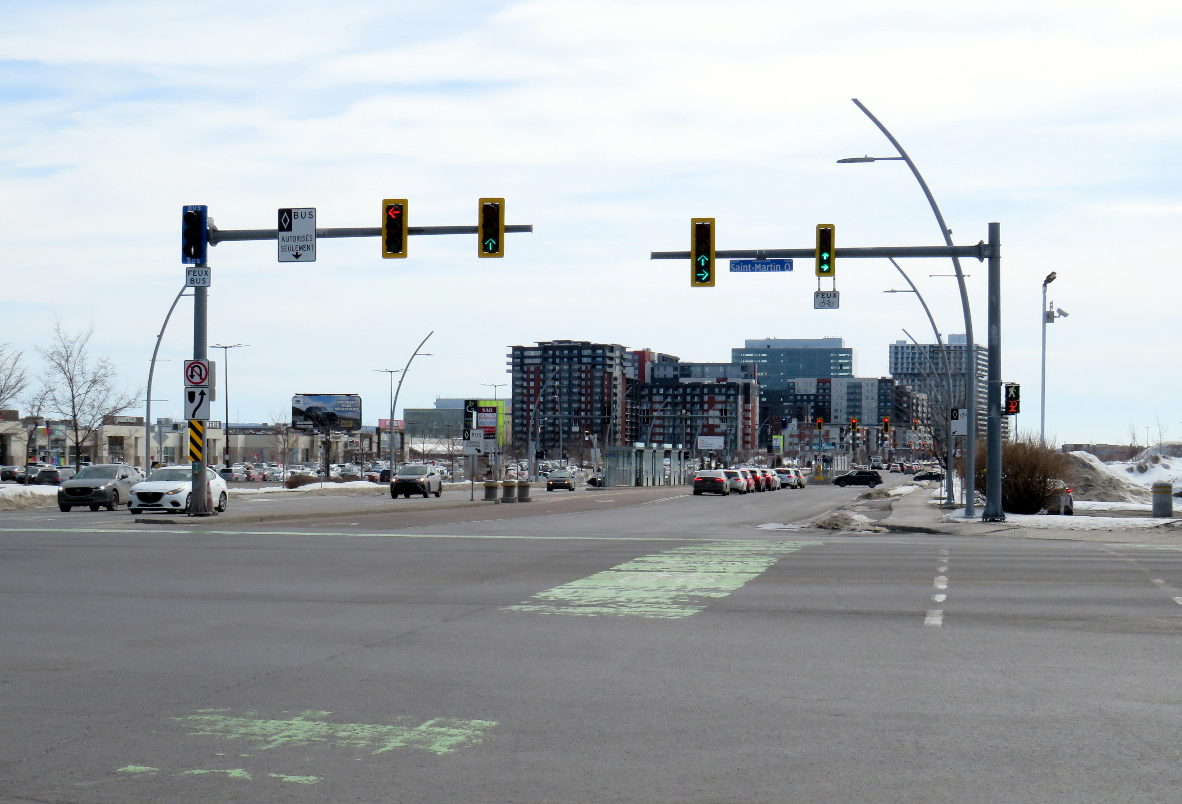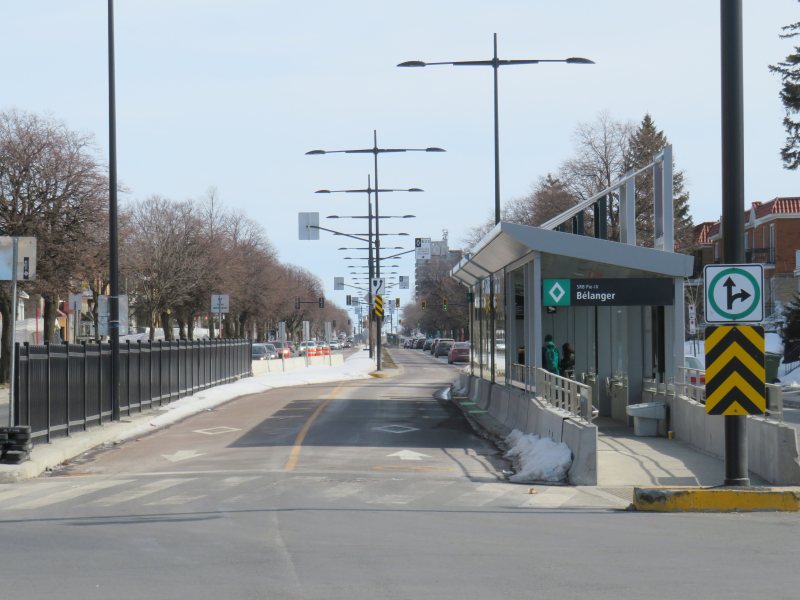 Unlike median busways elsewhere in Ontario or Quebec, buses are not slowed down by left-turning motorists as left turns are prohibited along the entire SRB corridor. This simplifies operations, allows for easier transit priority, and reduces the space required at intersections for dedicated left turn lanes. Unlike Laval, the crosswalks in Montreal were cleared and easy to traverse in winter.