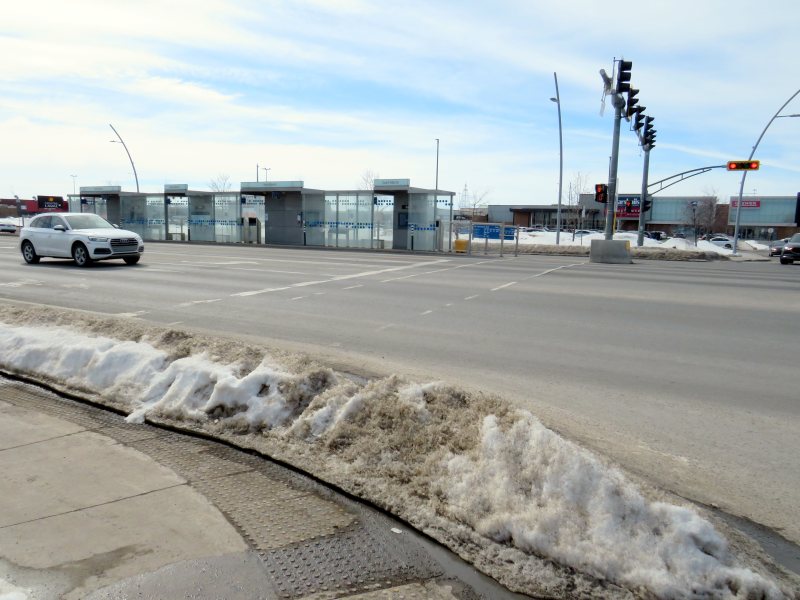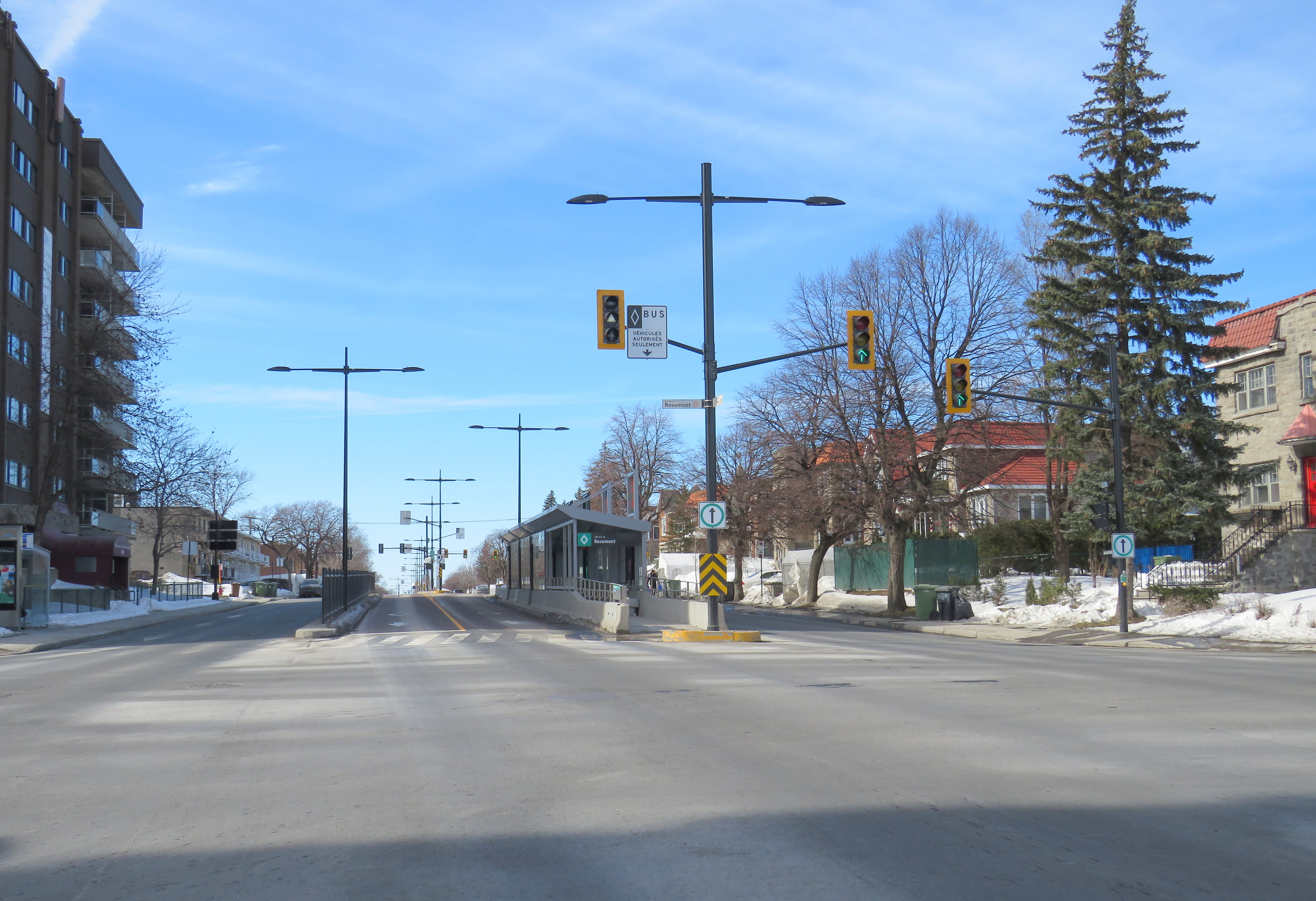 Finally, rapid transit corridors on arterial roads are reliant on walk-up traffic, and should therefore be as easy and safe as possible to walk up to the transit service. This means effective and quick snow removal at crosswalks, pedestrian priority (there should be no beg buttons to push to access BRT/LRT stops), and proper pedestrian infrastructure and a walkable realm. The Viva Rapidways and the Laval Boul. Le Corbusier fail this basic criteria, while Montreal does a better job.