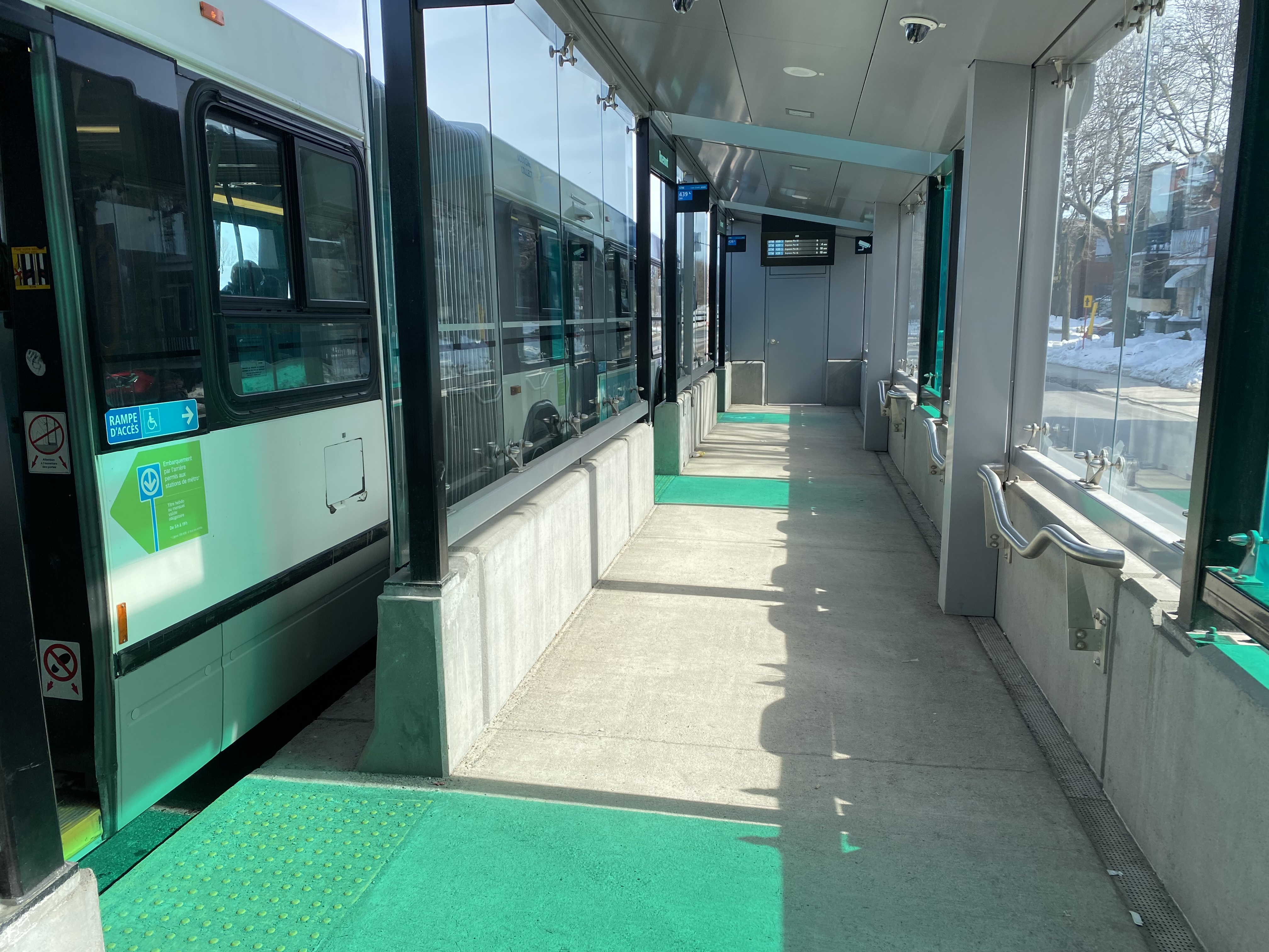 The 439 SRB route parallels the local 139 Pie-IX bus, and like other median busways, passengers board and exit at stops at the far side of the intersection. Though there is no fare pre-payment, passengers are permitted to board at rear doors with a valid Opus card or ticket. Shelters are simple, but the stained green glass lines up nicely with the gaps where the bus doors open.