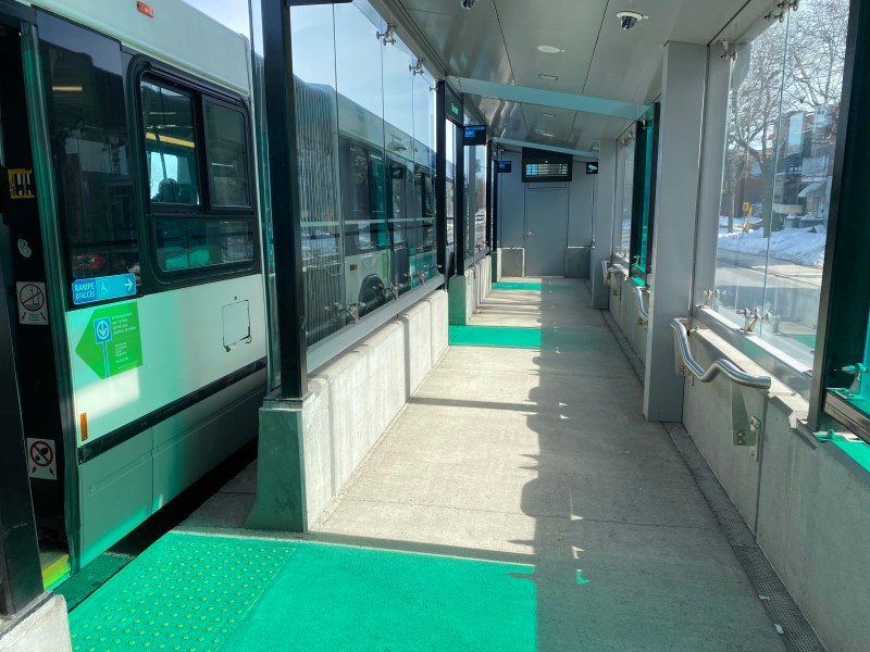 The SRB (BRT) corridor on Montreal’s Boulevard Pie-IX, which I visited later the same day, was a welcome contrast to Laval’s implementation. Boulevard Pie-IX (named for Pope Pius IX, the founder of the dogma of papal infallibility), is a wide north-south boulevard on Montreal’s east side, passing through Hochalaga, past Olympic Stadium and the Botanical Gardens, all the way into Laval. It’s a busy bus corridor, feeding into the Métro Green Line as well as the future extension of the Blue Line to Anjou.