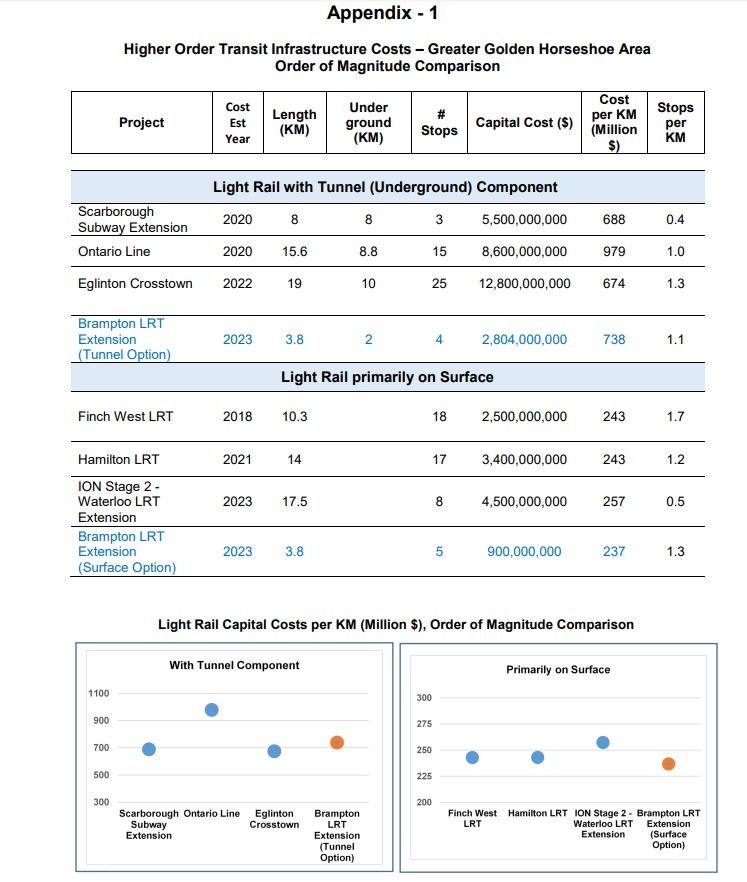 An appendix to the staff report compares the cost of the tunnel option with other tunnelled Ontario projects (the Scarborough Subway Extension, the Ontario Line, the Eglinton-Crosstown), and the surface alignment with other surface projects (Finch West LRT, Hamilton LRT, Ion LRT extension in Cambridge).