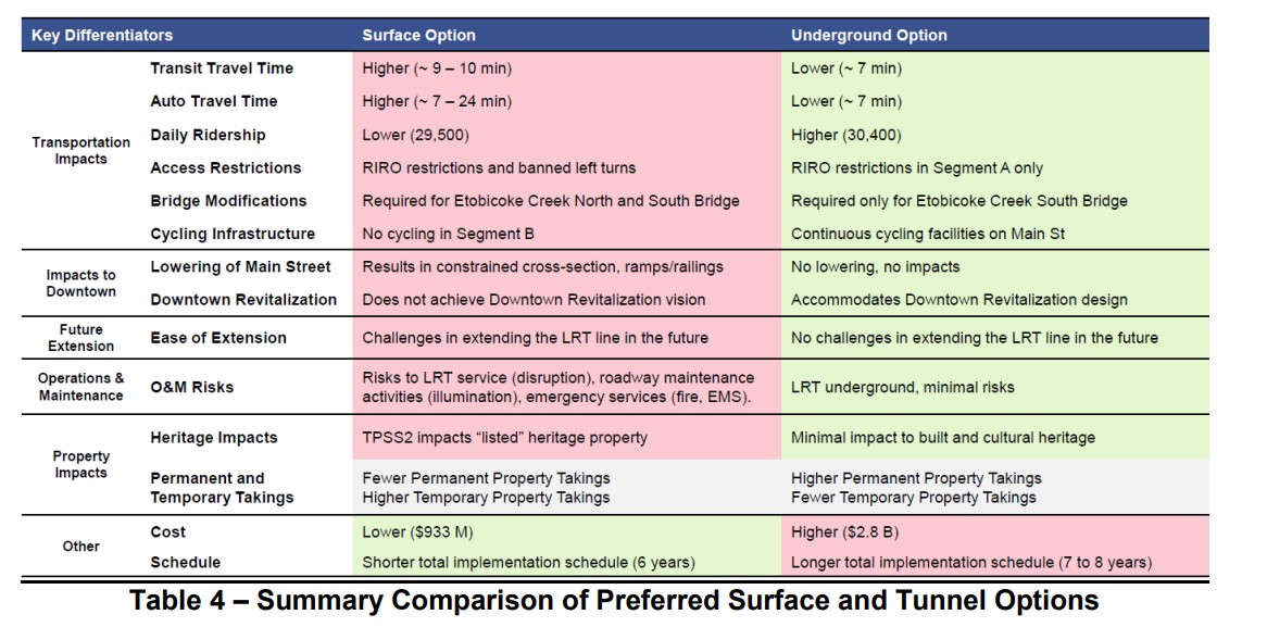 The two options were compared, putting the tunnel alignment ahead in all categories apart from cost and schedule. The tunnel would allow for continuous cycling infrastructure on Main Street, minimize traffic impacts, while having slightly higher ridership and somewhat faster transit. The tunnel would also better satisfy homeowners and businesses along the corridor. Staff also note that the tunnel alignment, without the bend into the GO station property, would be easier to extend farther north.