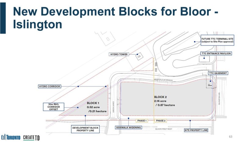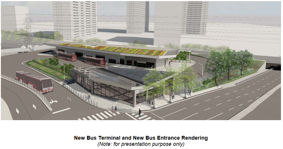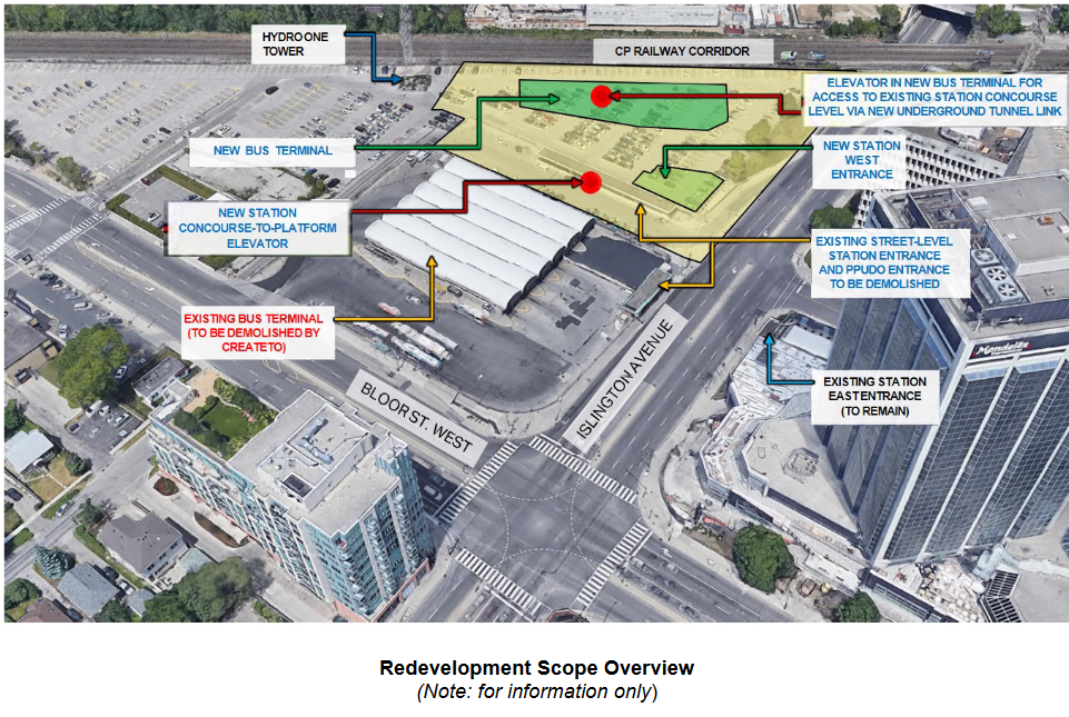 In 2021, a new plan to rebuild the station was presented to the public. It would include a new six-bay bus terminal in the commuter parking lot north of the existing terminal. Upon completion, the old bus area would be redeveloped under the city’s CreateTO housing program. Aberfoyle Crescent, which connects Islington Avenue and Bloor Street, would be extended through the station property to provide bus access and allow for development of the rest of the station property. The site is constrained by the same Hydro One corridor that stymied construction of the new Kipling terminal (much of the parking lot is under hydro wires), but this is a much smaller bus terminal, and hopefully lessons were learned this time.