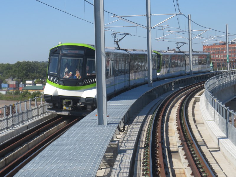 The Montreal-Brossard segment is the first part of a four-branch network serving Montreal’s South Shore, West Island, and North Shore. The first phase that opened last month begins at Central Station, makes a stop at Île des Sœurs (Nuns’ Island) before crossing the St. Lawrence River on the new Champlain Bridge. It then follows Autoroute 10 south through the suburban municipality of Brossard, before terminating south of the Autoroute 10/30 interchange. The trip is quite speedy. Riding from Brossard to Central Station takes 19 minutes, with the fastest cruising speeds (80 km/h) made on the Champlain Bridge.