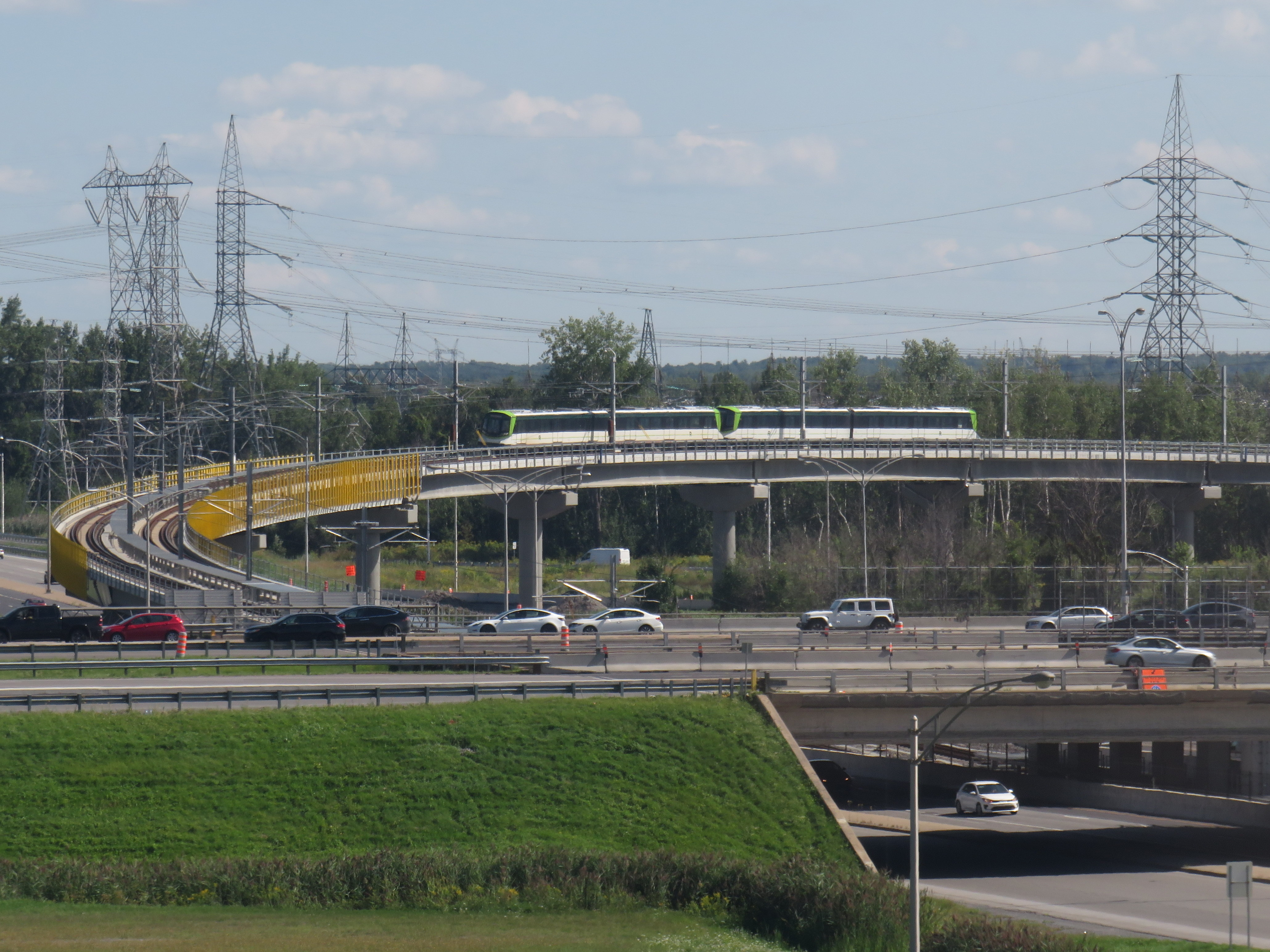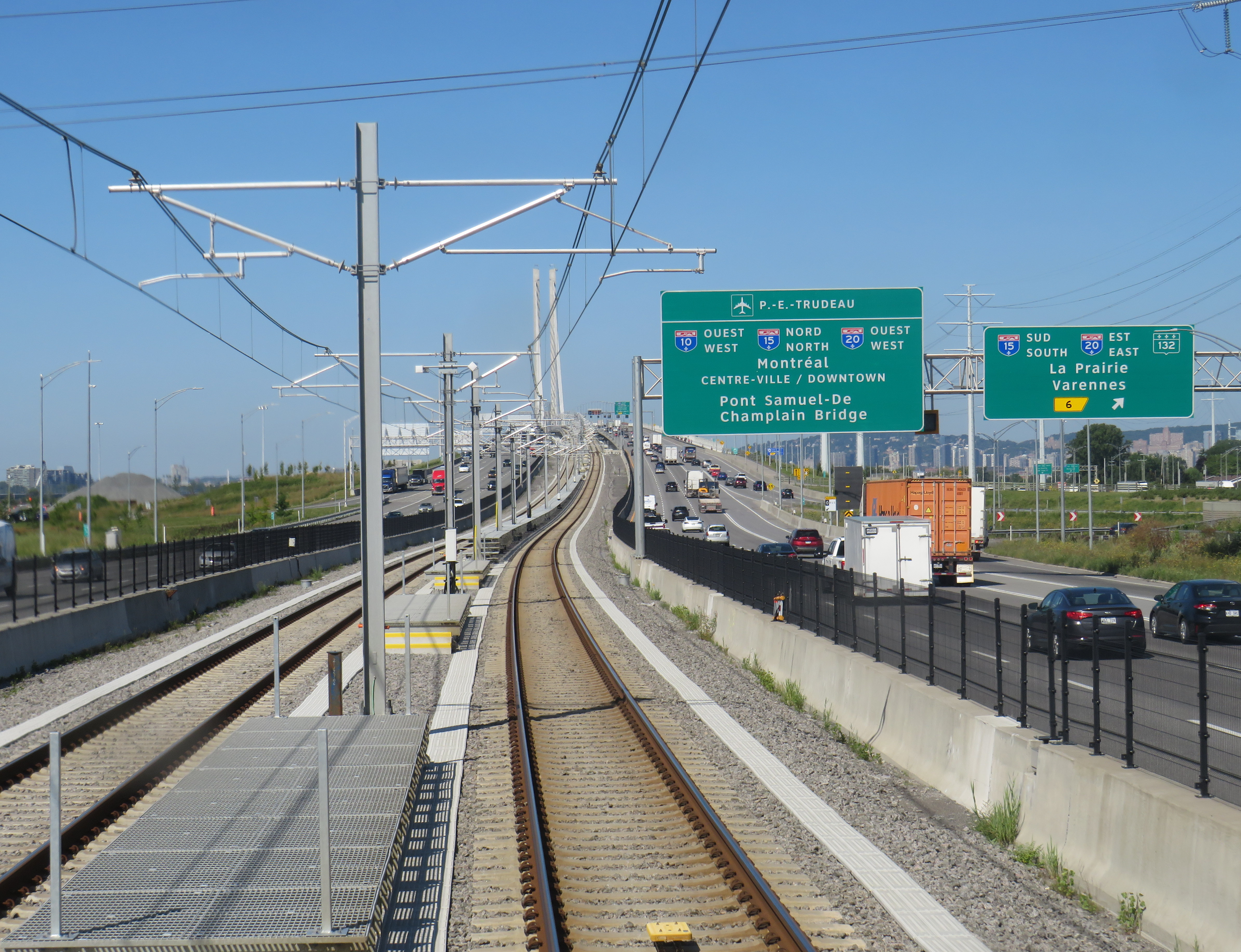 The Montreal-Brossard segment is the first part of a four-branch network serving Montreal’s South Shore, West Island, and North Shore. The first phase that opened last month begins at Central Station, makes a stop at Île des Sœurs (Nuns’ Island) before crossing the St. Lawrence River on the new Champlain Bridge. It then follows Autoroute 10 south through the suburban municipality of Brossard, before terminating south of the Autoroute 10/30 interchange. The trip is quite speedy. Riding from Brossard to Central Station takes 19 minutes, with the fastest cruising speeds (80 km/h) made on the Champlain Bridge.