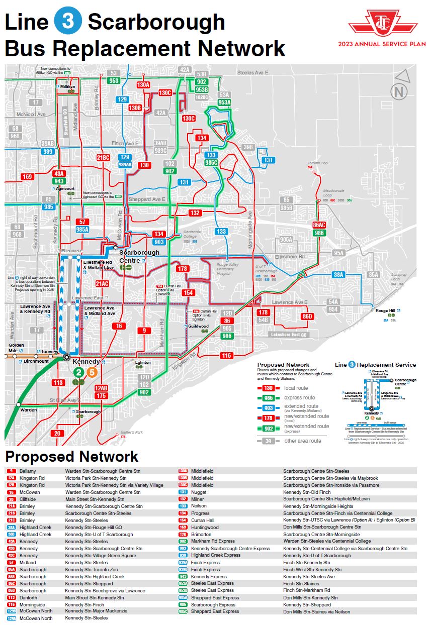 In November, several Scarborough routes will be extended from Scarborough Centre to Kennedy Station to reduce the number of bus transfers. Busy routes such as 38 Highland Creek, 129 McCowan North, 133 Neilson, and 939 Finch East will be extended south to Kennedy via the bus lanes (and later, the busway).