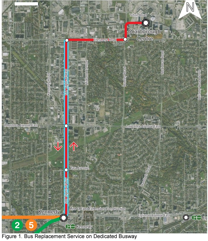 For now, Route 903, an express bus stopping only at Lawrence Avenue East and Ellesmere Avenue is operating; temporary bus lanes have been painted on Midland Avenue (southbound) and Kennedy Road (northbound) to mitigate delays and handle the demand. In the short term, exclusive bus lanes, queue-jump lanes, turn restrictions, signal priority, and other measures on Ellesmere, Brimley, Midland, Kennedy, and Eglinton will help prioritize buses before the southern half of the SRT corridor can be converted to a busway. For her part, newly elected mayor Olivia Chow is backing the accelerated conversion.