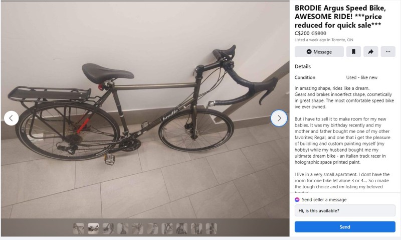 Back on the Cycling in Toronto Facebook Group, members suggested posting to another FB group, called Stolen Bikes – Toronto. After my membership was approved, I posted about the theft, and a member there quickly messaged me saying that they had just acquired the bike. I could meet him the next day, and I could get it from him. The person who purchased the bike said he followed the listing, feeling especially suspicious. Originally, it was listed for $400, but the person I met was able to get it for $150.