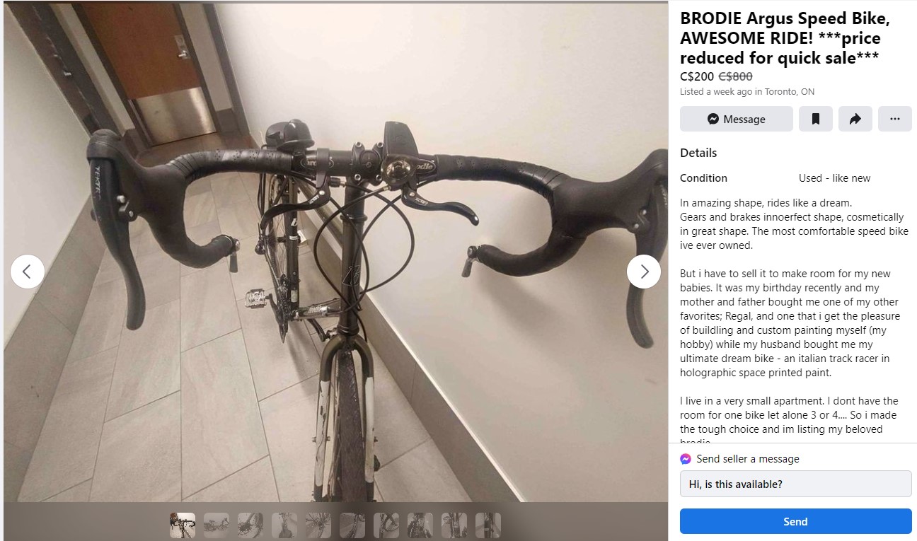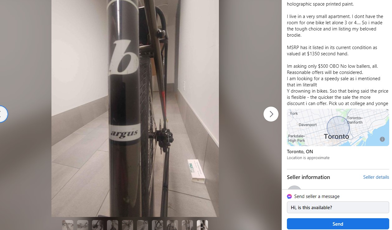 Back on the Cycling in Toronto Facebook Group, members suggested posting to another FB group, called Stolen Bikes – Toronto. After my membership was approved, I posted about the theft, and a member there quickly messaged me saying that they had just acquired the bike. I could meet him the next day, and I could get it from him. The person who purchased the bike said he followed the listing, feeling especially suspicious. Originally, it was listed for $400, but the person I met was able to get it for $150.