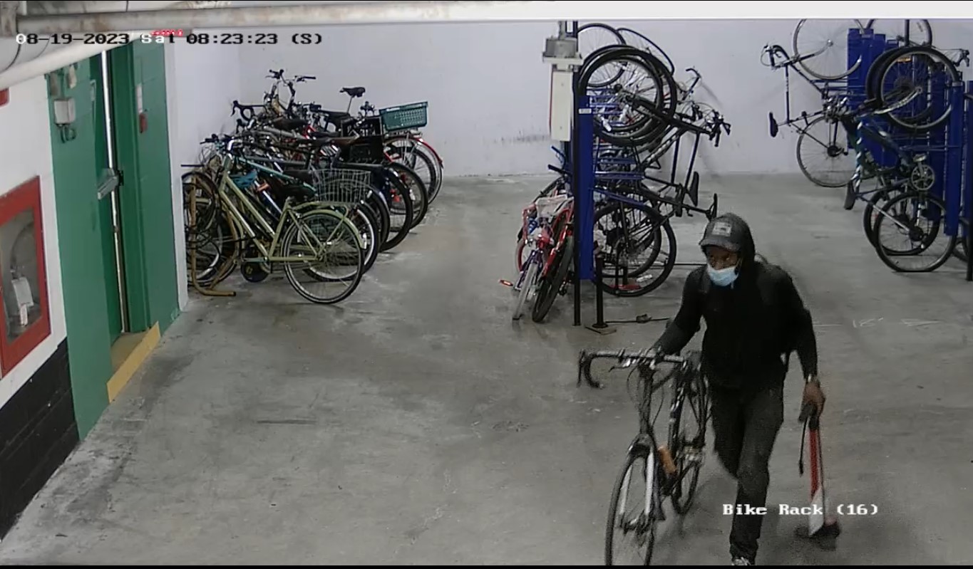 It took over a week before I discovered the bike missing as I had been really busy in August. When I discovered the theft, I informed the building management, and was able to get still photos and video of the thief. He was dressed in a black hoodie, with a black baseball cap and a surgical mask covering part of his face. His backpack had several tools, so he came in with a specific purpose. He did not cut the Kryptonite lock; instead he cut the rack and left with the lock still attached to the frame.