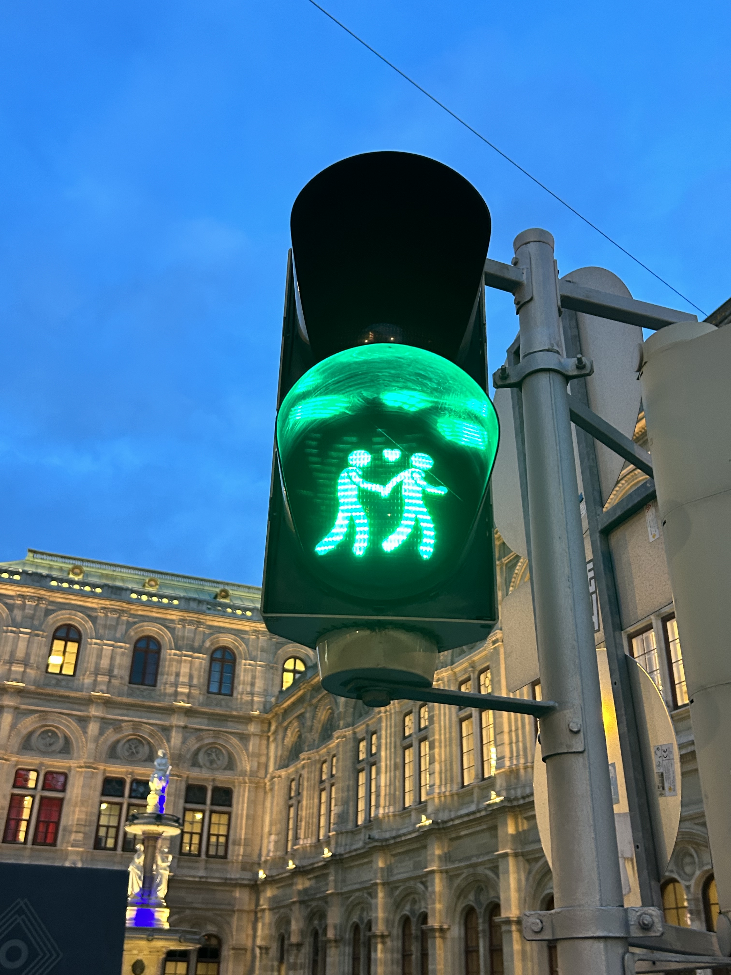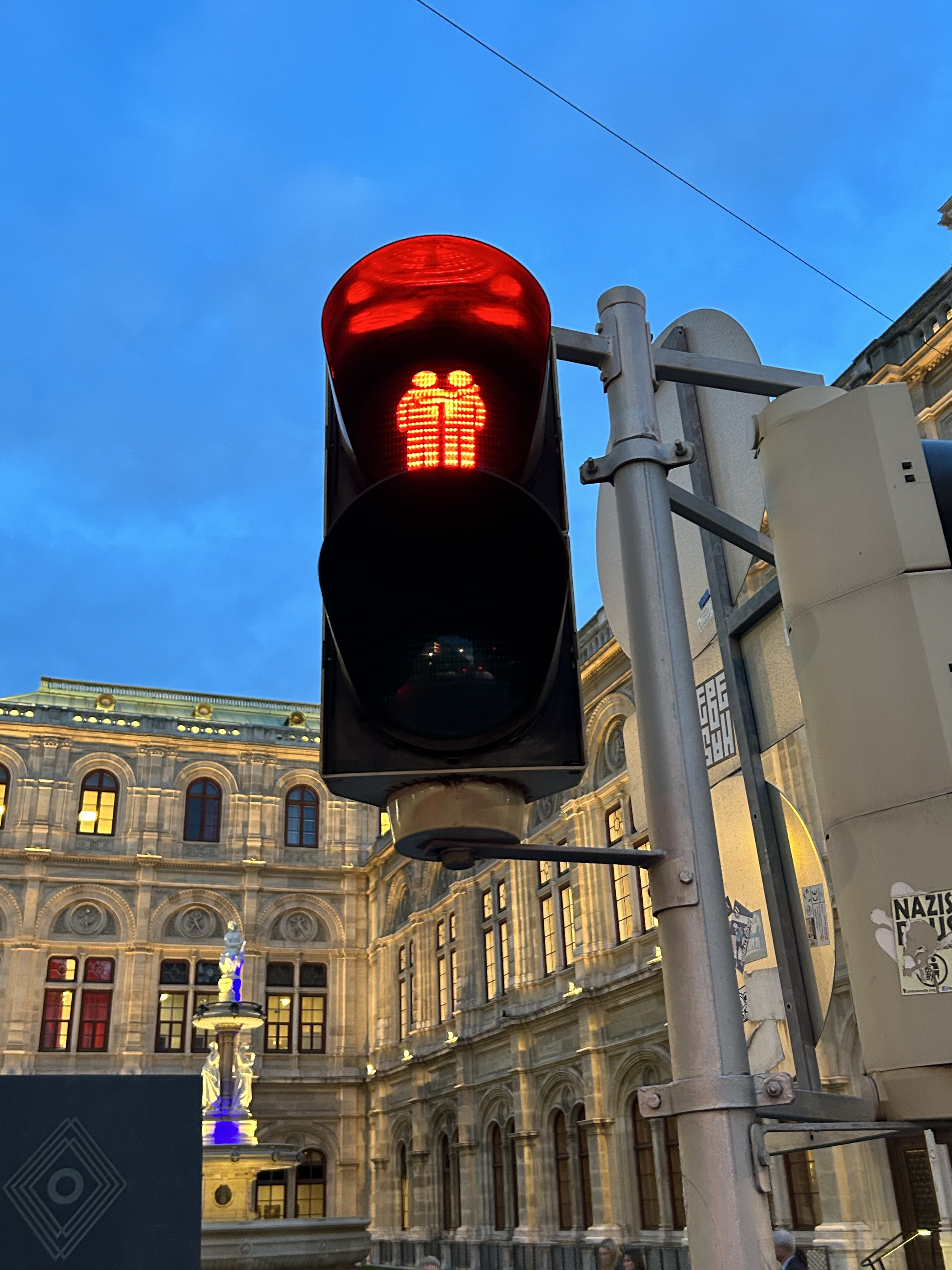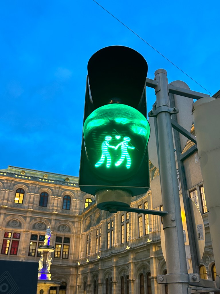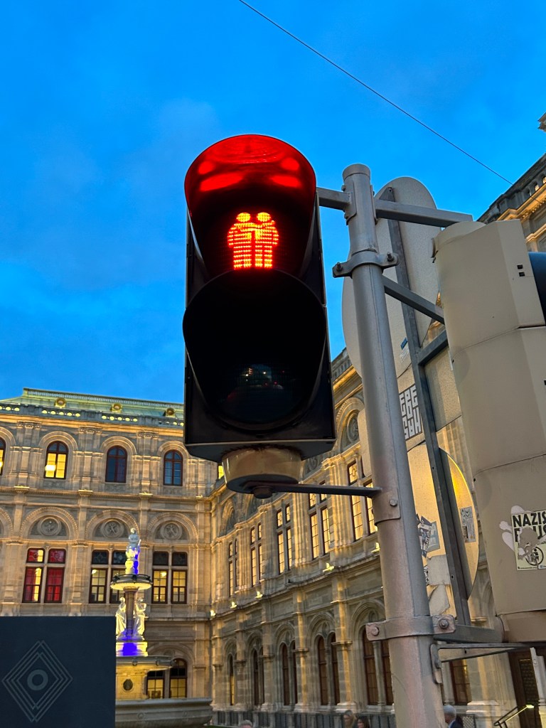 We noticed several pedestrian signs showing loving couples, rather than the standard, like this one in front of the Wiener Staatsoper (Opera House)