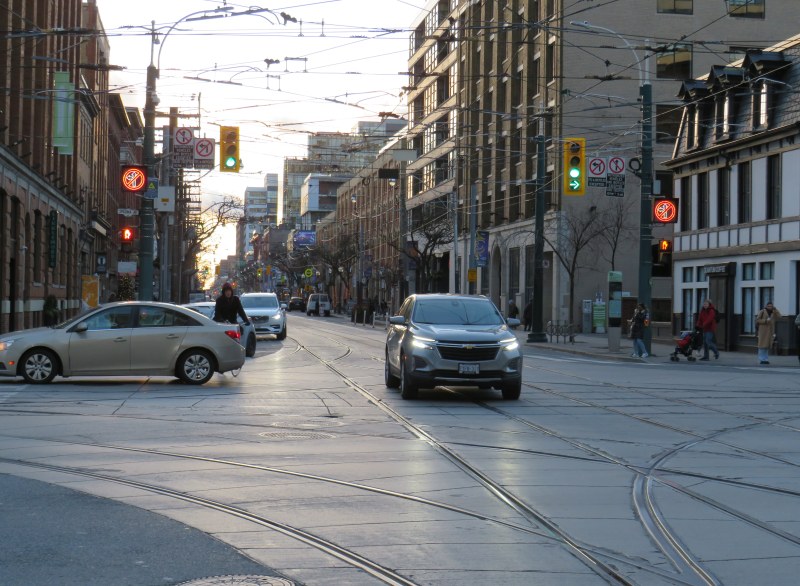 The problem is not just limited to through movements on King Street, though. On Tuesday, November 28, I stood at the corner of King and Spadina between 4:00 PM and 4:20 PM. The backup of cars and trucks headed southbound towards the Gardiner Expressway extended into the south side crosswalk and into the eastbound lanes at times. Motorists are not permitted to enter an intersection on a green light if they cannot clear it before the light turns red; this causes gridlock. But on more than one occasion, streetcars and pedestrians were impeded by illegal intersection blocks.