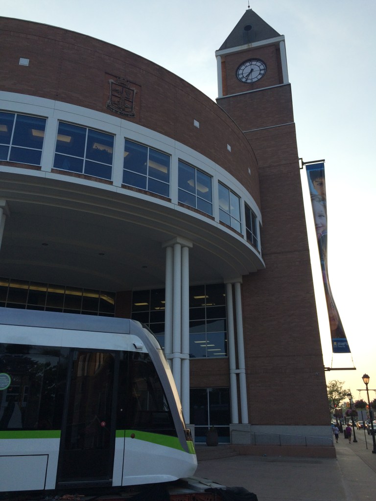 Mock-up of a light rail vehicle in front of Brampton City Hall in 2015
