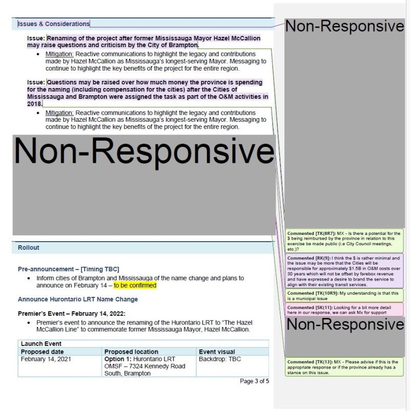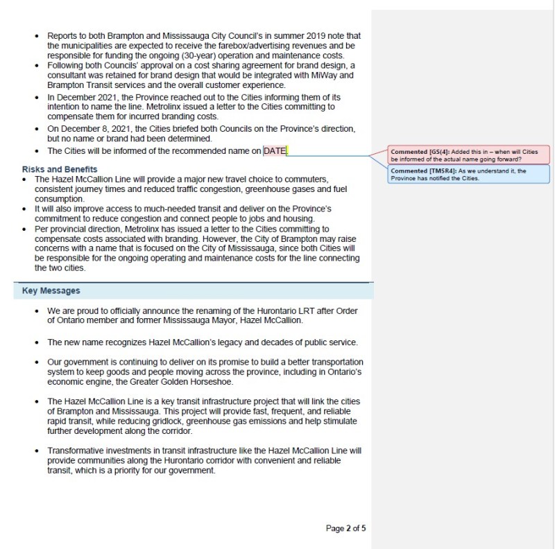 Anticipating media questions about renaming the LRT after McCallion and whether there was any negative reaction or criticism from the City of Brampton, the mitigating strategy was just to repeat the messaging about “the legacy and contributions made by Hazel McCallion as Mississauga’s longest sitting mayor.” The same advice was given if there were questions about the extra costs of rebranding the line after the cities were ready to present their proposal.