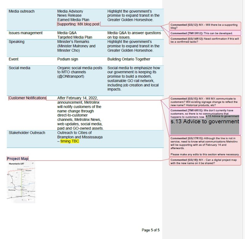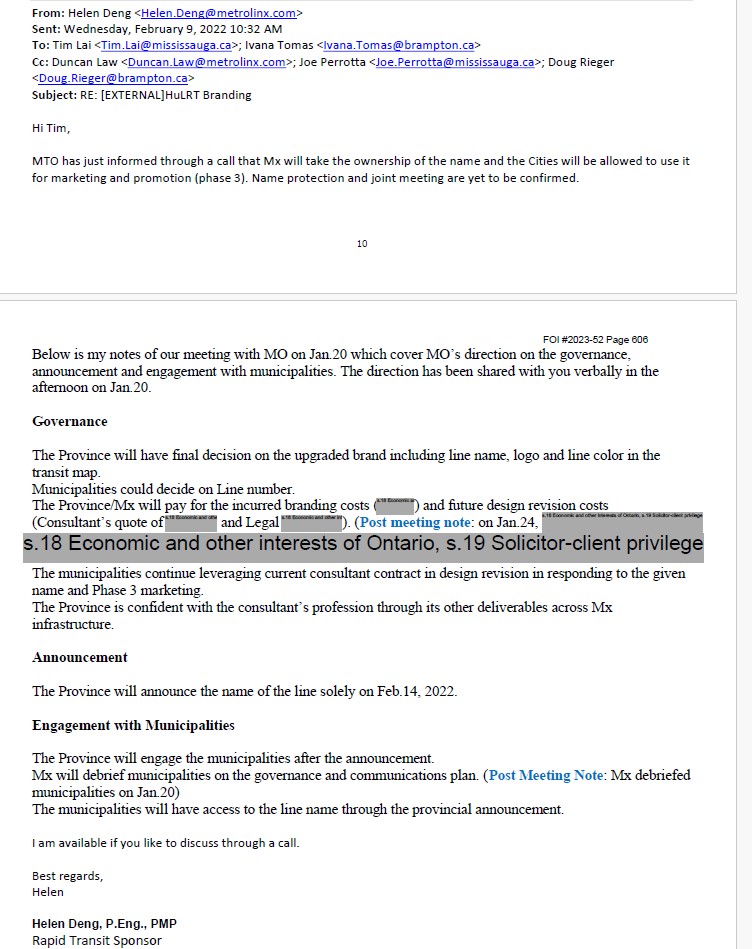 My freedom of information request to Metrolinx, sent in July 2023, asked for documents between Metrolinx, the Ministry of Transportation (MTO), and the City of Mississauga, with the purpose of determining the origin and rationale of the LRT’s proposed renaming, impacts on Metrolinx’s communications and community relations, and precedents for future transit project renaming/rebranding. On January 24, 2024, I received a PDF with over 1600 pages of highly redacted emails and communications between Metrolinx and MTO.