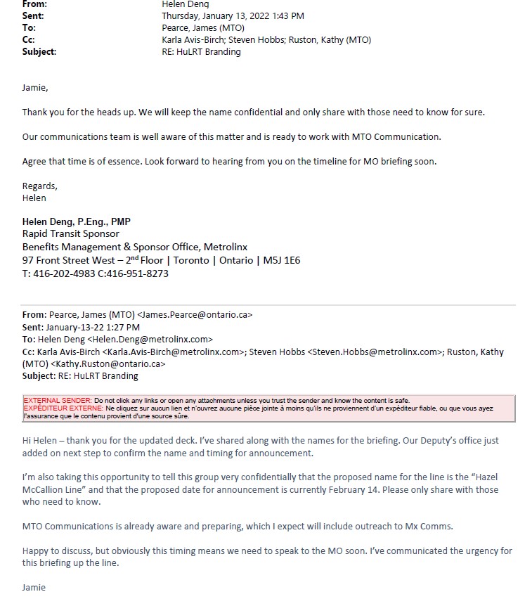 James Pearce, the director of transit capital & operations at MTO and previously a senior policy advisor at the Ontario Cabinet Office, notified Metrolinx of the province’s intent of naming the LRT after McCallion on January 13, 2022, with the direction that it be kept confidential, and that a meeting with the Minister’s Office (MO) would soon follow. Pearce also revealed that the official announcement would take place on February 14, McCallion’s birthday. MTO’s communications branch would prepare materials for the official announcement.