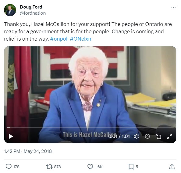 Hazel McCallion’s endorsement of Doug Ford and the Ontario PCs in 2018 (click for link/video)