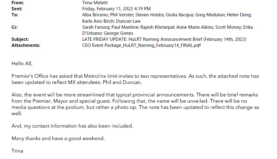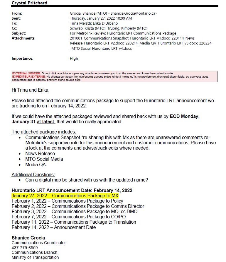 The communications for the February 14 announcement were tightly controlled by MTO communications staff, with input from Metrolinx and sign-off from the Premier’s Office.