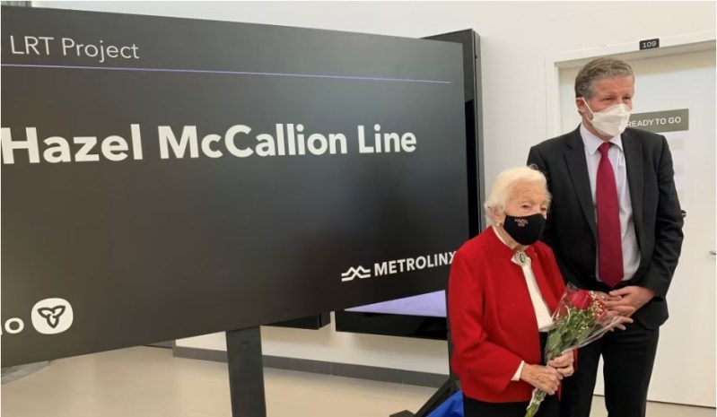 On February 14, 2022, at Cooksville GO Station, Premier Doug Ford, then Transportation Minister Caroline Mulroney, then Mississauga Mayor Bonnie Crombie, and Metrolinx CEO Phil Verster joined former Mississauga mayor Hazel McCallion announcing the name change from the Hurontario LRT to the Hazel McCallion LRT. The occasion also marked McCallion’s 101st birthday.