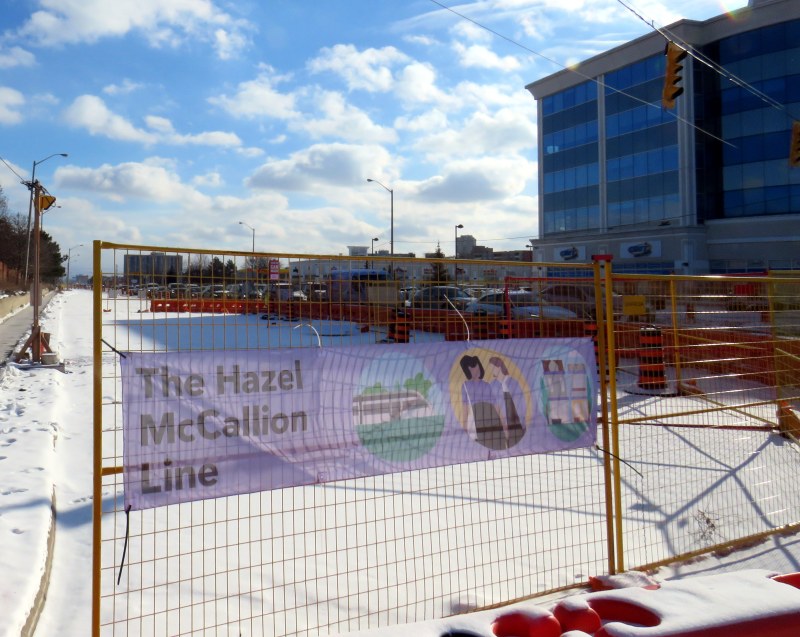 Banner promoting “The Hazel McCallion Line” on Hurontario Street in Brampton, January 2024