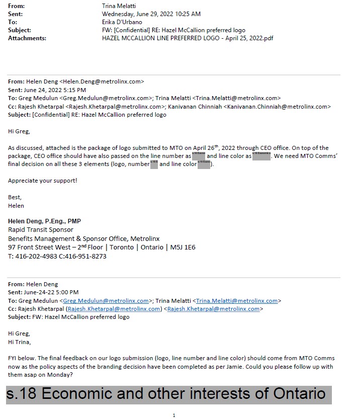 After the announcement in February 2022, most of the remaining communications in the FOI package related to choosing the LRT’s line number, colour, and logo. Those were all redacted under Section 18(1) of the FIPPA.