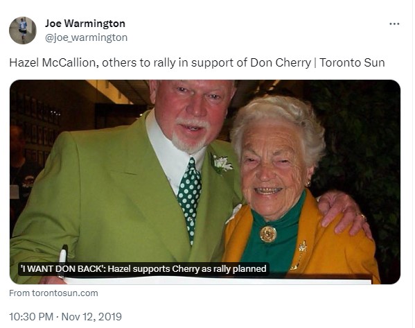 Tweet from the Toronto Sun’s Joe Warmington, after Don Cherry’s firing from ‘Hockey Night in Canada’ on November 11, 2019