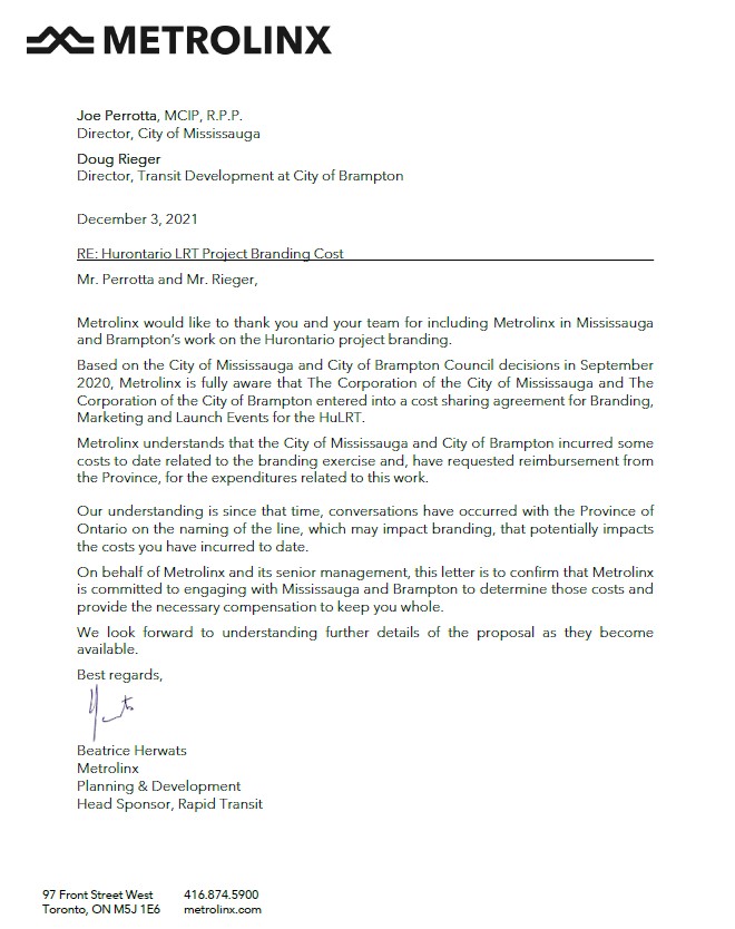 Letter from Beatrice Herwats, Head Sponsor, Rapid Transit at Metrolinx to officials at the City of Brampton and the City of Mississauga informing them of the province’s decision to name the line itself. It also promises that the two cities would be compensated for their branding costs.