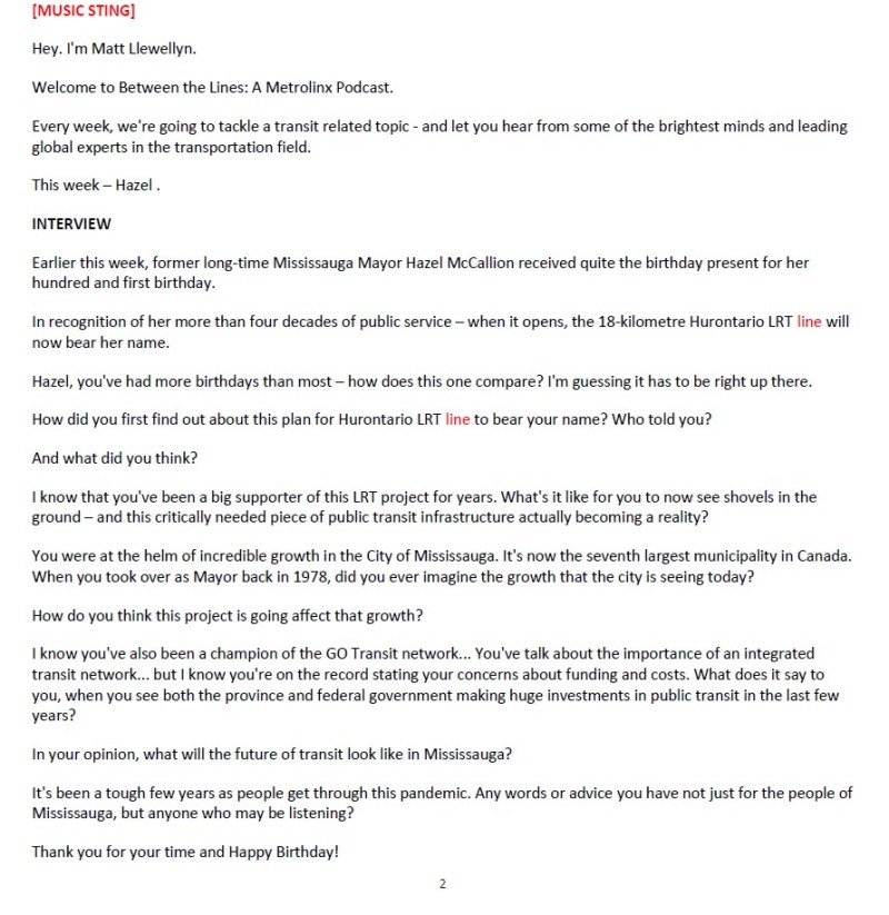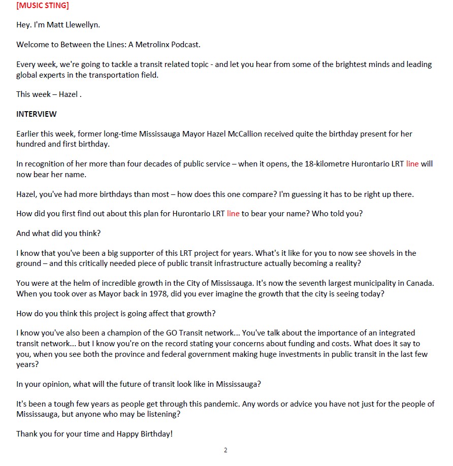 Draft script for “Between the Lines: a Metrolinx Podcast”