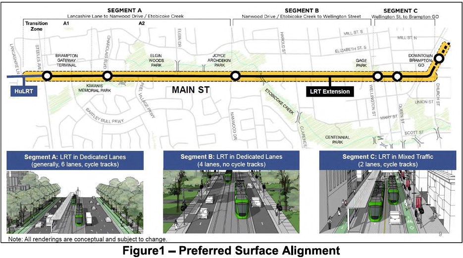 The proposed surface alignment from Steeles Avenue to Downtown Brampton