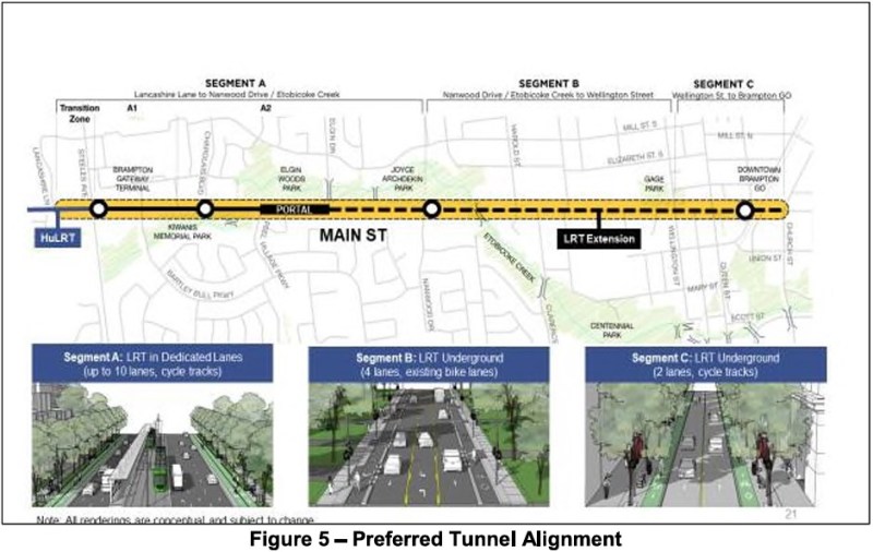 Recently, Brampton City Council has been much more supportive of the LRT extension into Downtown Brampton; only one councillor who opposed the LRT in 2015 is still in office. However, the city supports a bored tunnel under Main Street through the downtown core, with the tunnel segment beginning at Elgin Drive. The proposed $2.8 billion tunnel extension would feature two underground stops, at Nanwood Drive and near the Brampton GO Station. An at-surface alignment would require mixed-traffic operations but would be significantly cheaper and easier to construct ($933 million, including a below-grade terminal at the GO Station). The surface alignment would allow for additional stops at Wellington Street (for Gage Park and City Hall) and at Queen Street.