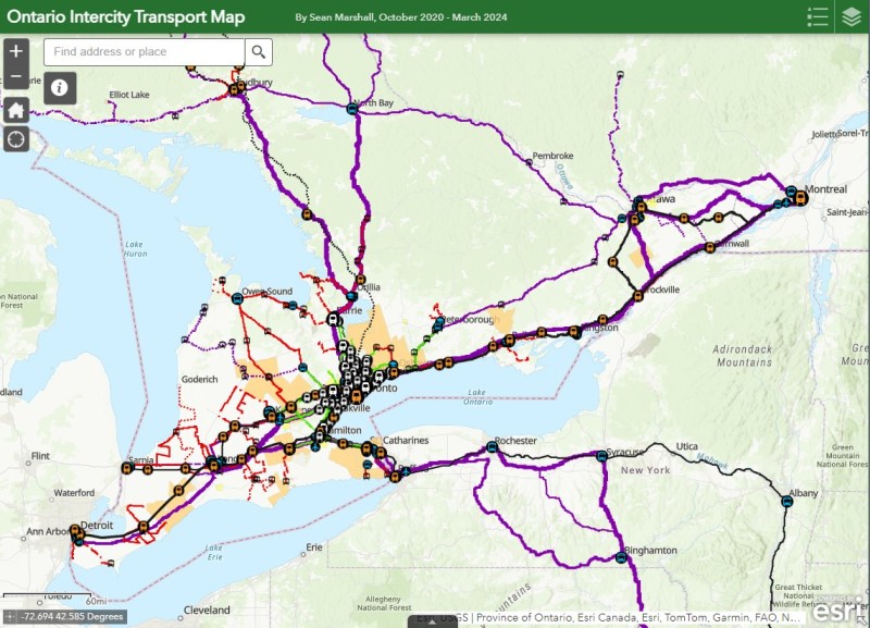 I updated my map of Ontario’s intercity transport services for March 2024, including the new Onex Bus and Intercity Bus routes in Southwestern Ontario. There are new services in East Zorra-Tavistock, connecting to Stratford and Woodstock, and in North Grenville. Unfortunately, Lindsay and Haliburton lost their TOK coach service, Prescott & Russell ended its on-demand service, and gaps remain in Bruce, Elgin, and Haldimand Counties.