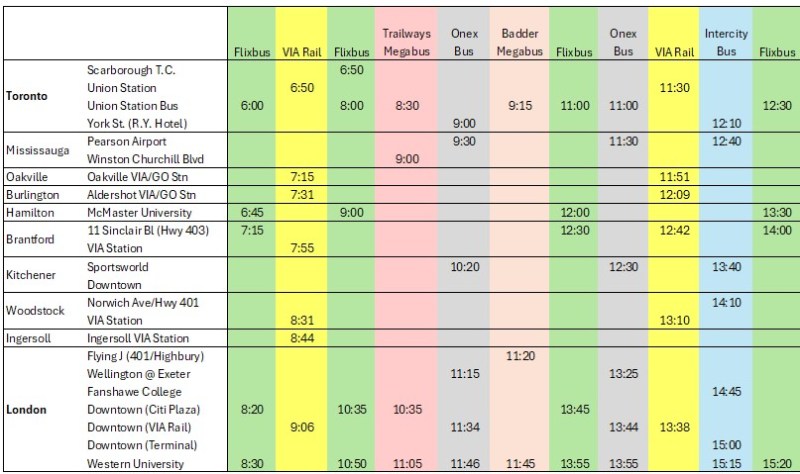 In late 2023, yet another intercity bus operator started serving the busy Toronto-London corridor, operating between Toronto and London. With the rather unimaginative name of “Intercity Bus,” this new company operates up to four trips a day between Toronto and London. It has since added a route between London and Sarnia; it also plans to run the much-needed link between London and St. Thomas.