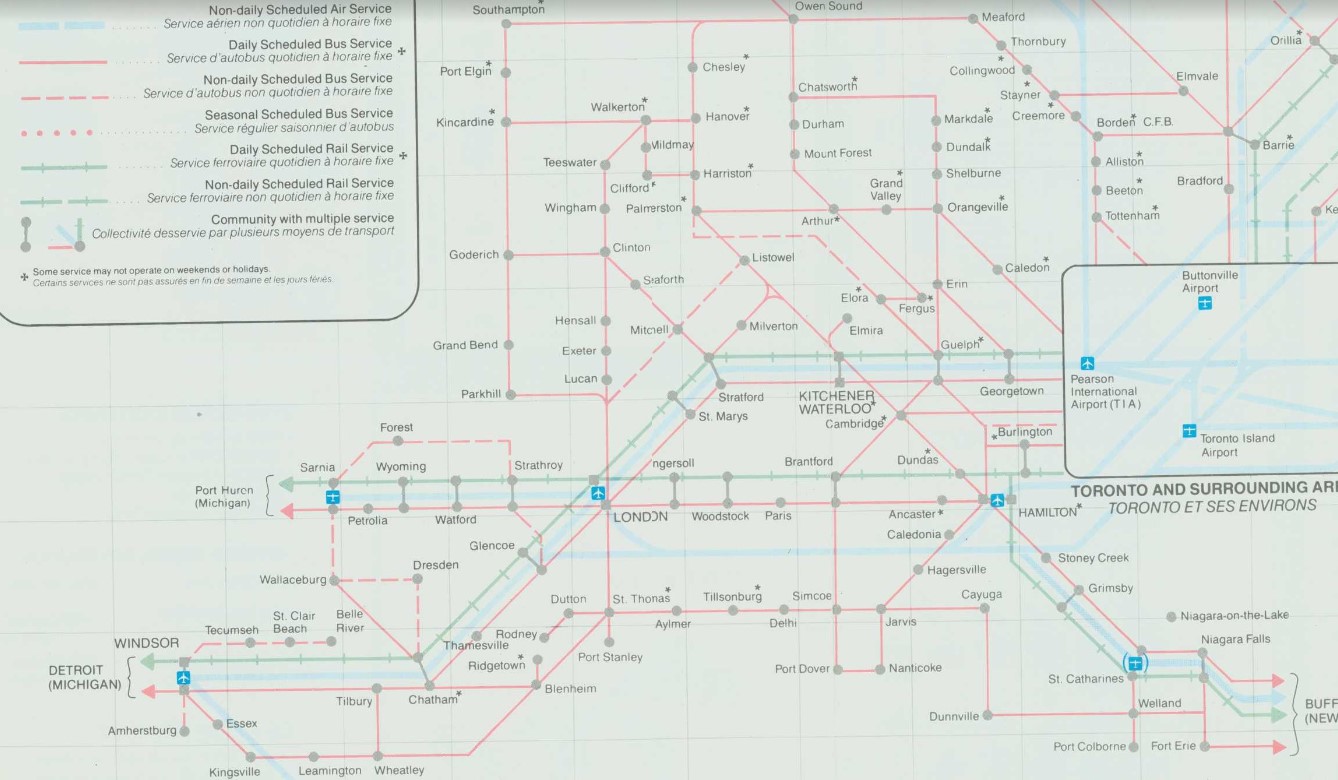 Detail from 1990-1991 Ontario Intercity Transportation Guide, showing bus routes from London to points throughout Southwestern Ontario