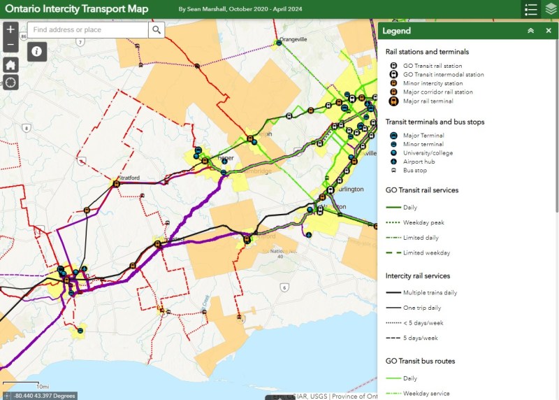 NOTE: Previous versions of the Ontario and Canada maps are retired; please see the new Canada Intercity Transport Map, launched March 30, 2025. This will now be the only interactive map that I will update.