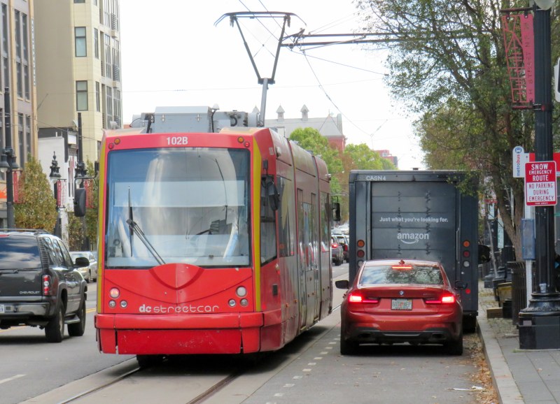 Like most modern streetcar lines in the United States, the DC Streetcar runs in mixed traffic, in the outer driving lane. This allows for platform level boarding from the sidewalk at each stop, but it also leaves the streetcar susceptible to traffic delays due to congestion and from stopped cars and trucks. Though there are parking and layby spaces to the right of the streetcar track, a wide or improperly stopped vehicle can easily disrupt service. Streetcars regularly squeeze past properly parked delivery vans, as in the photo below.