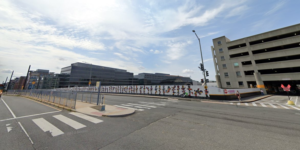 Though Union Station is the western terminus of the short streetcar line, the connection to the Metro Red Line, Amtrak, MARC, and VRE trains is awkward. H Street is to the north of Union Station, crossing over the multitude of tracks leading into the station platforms on a long overpass. The streetcar stops halfway across, in the median. Passengers getting off the streetcar must walk further west on the median, then cross the eastbound lanes of H Street at a traffic signal controlling a driveway exit from the Union Station parking garage. A poorly marked sidewalk provides the connection into the parking garage (which also houses the Union Station intercity bus terminal) and down towards the main station building.