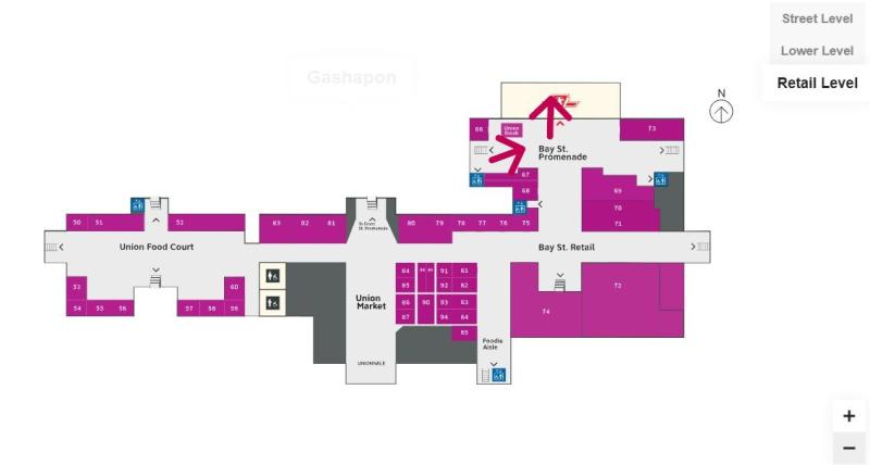 Confusingly, the official Union Station map directory calls the three levels “Street Level” (G, the Heritage structure including the Great Hall, West and East Wings, along with the path towards UP Express and the Skywalk), “Lower Level” (B1, the GO York and Bay Concourses, the concourse beneath the Great Hall, and the VIA departure area) and “Retail Level” (B2, including the food court, food hall, and connections to the subway). In the elevators, the audio prompts only mention the three level names.