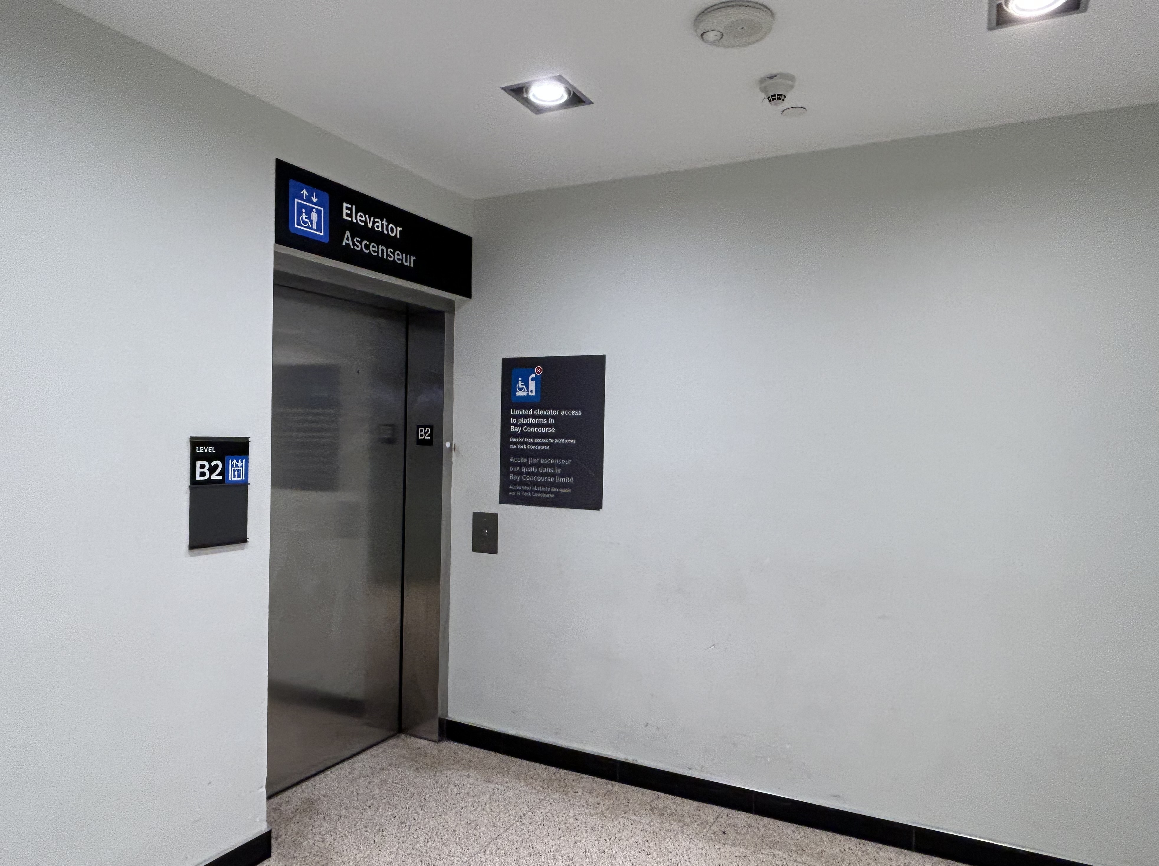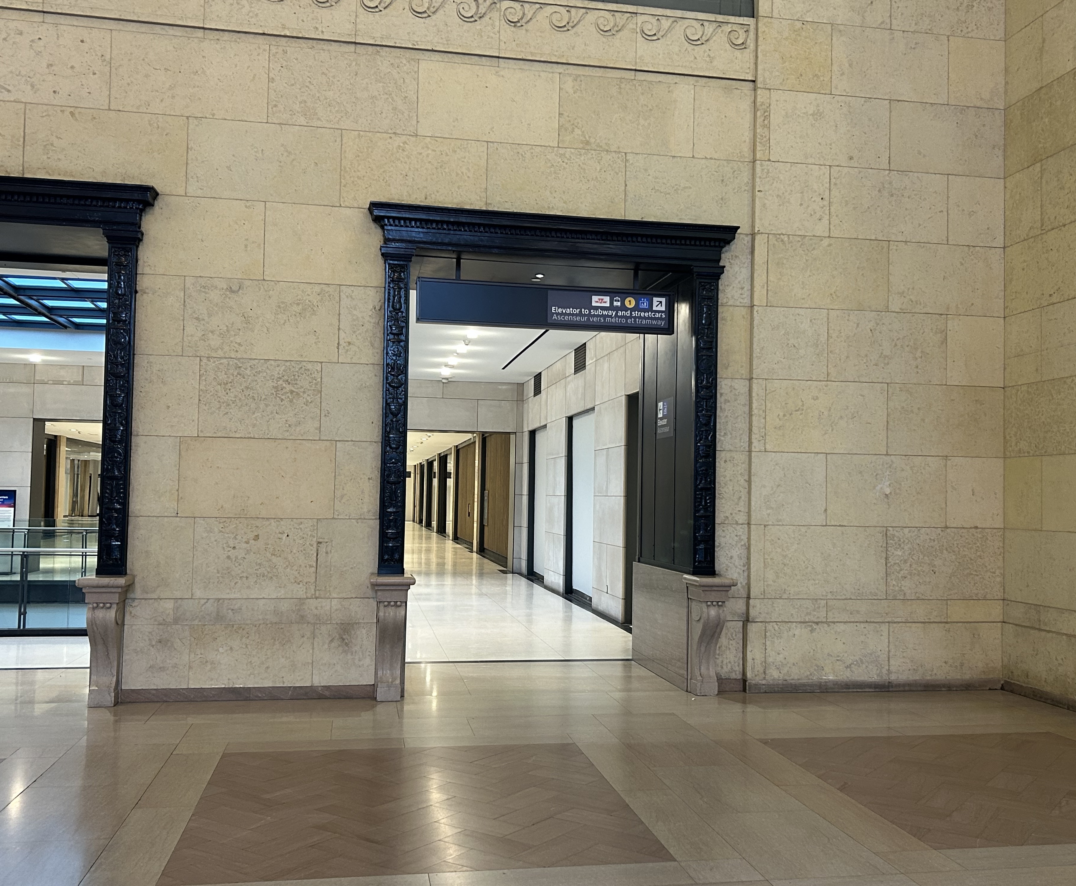 At G level, which includes the Great Hall, VIA Rail departures and business class lounge, and the passage west towards UP Express trains and the Skywalk to the CN Tower and Rogers Centre, the elevator is also hidden behind a wall.